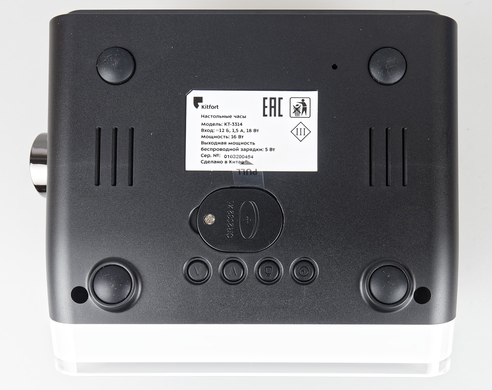 Снизу мы видим наклейку с технической информацией, под ней — лампу для ночной подсветки, ниже — место установки батареи CR2032 (пригодится на случай кратковременного отключения электричества), еще ниже — четыре кнопки для всевозможных настроек.
