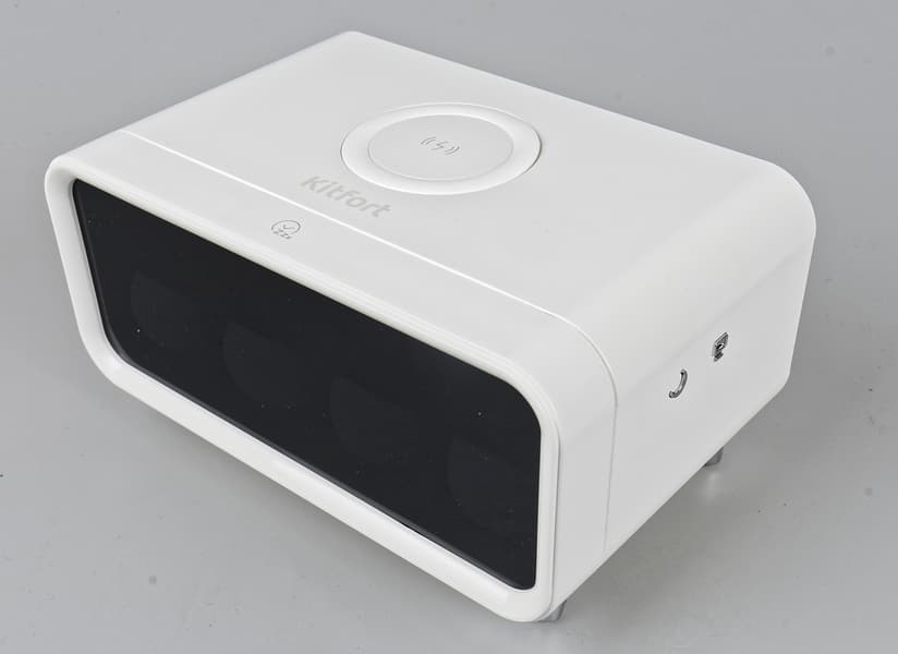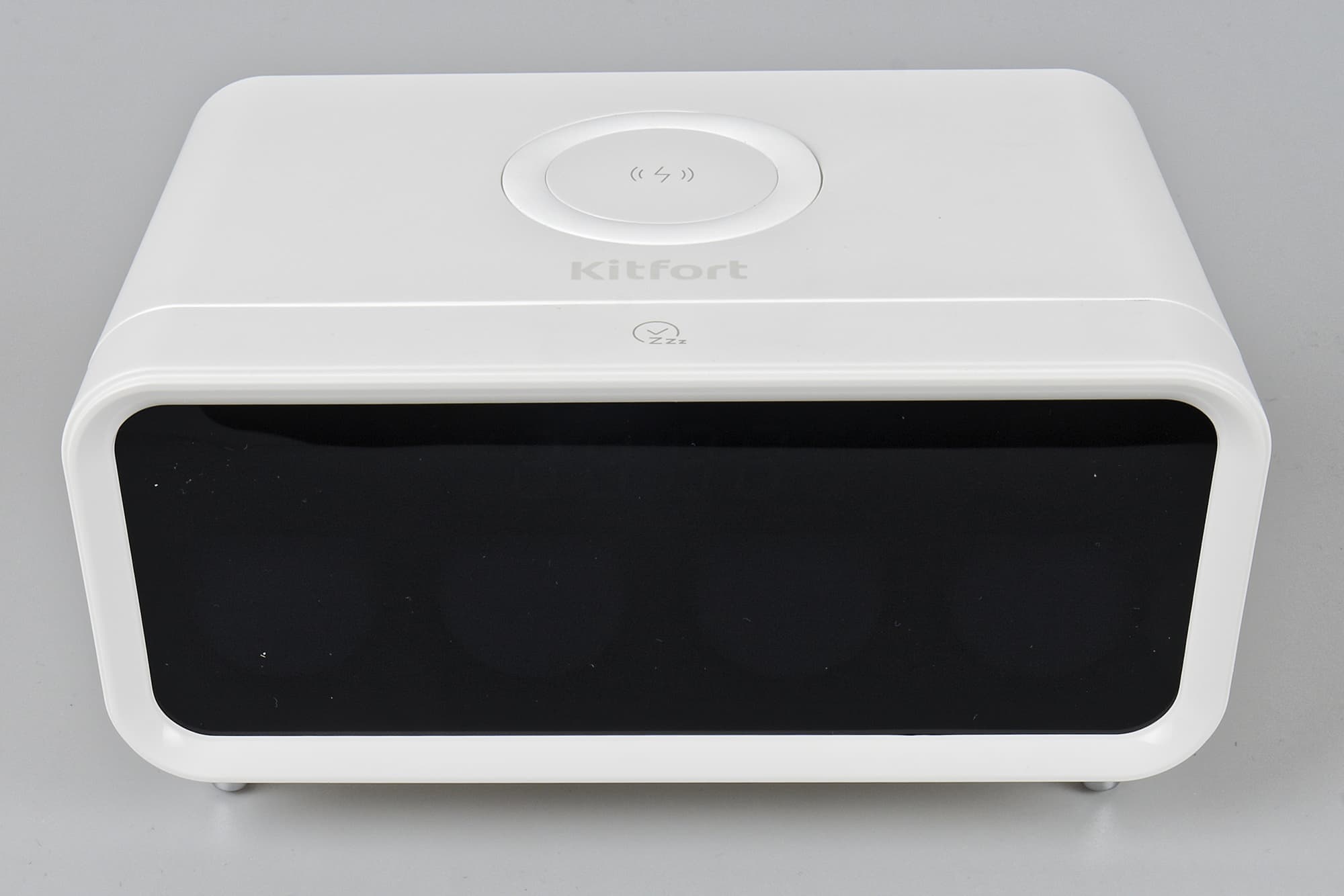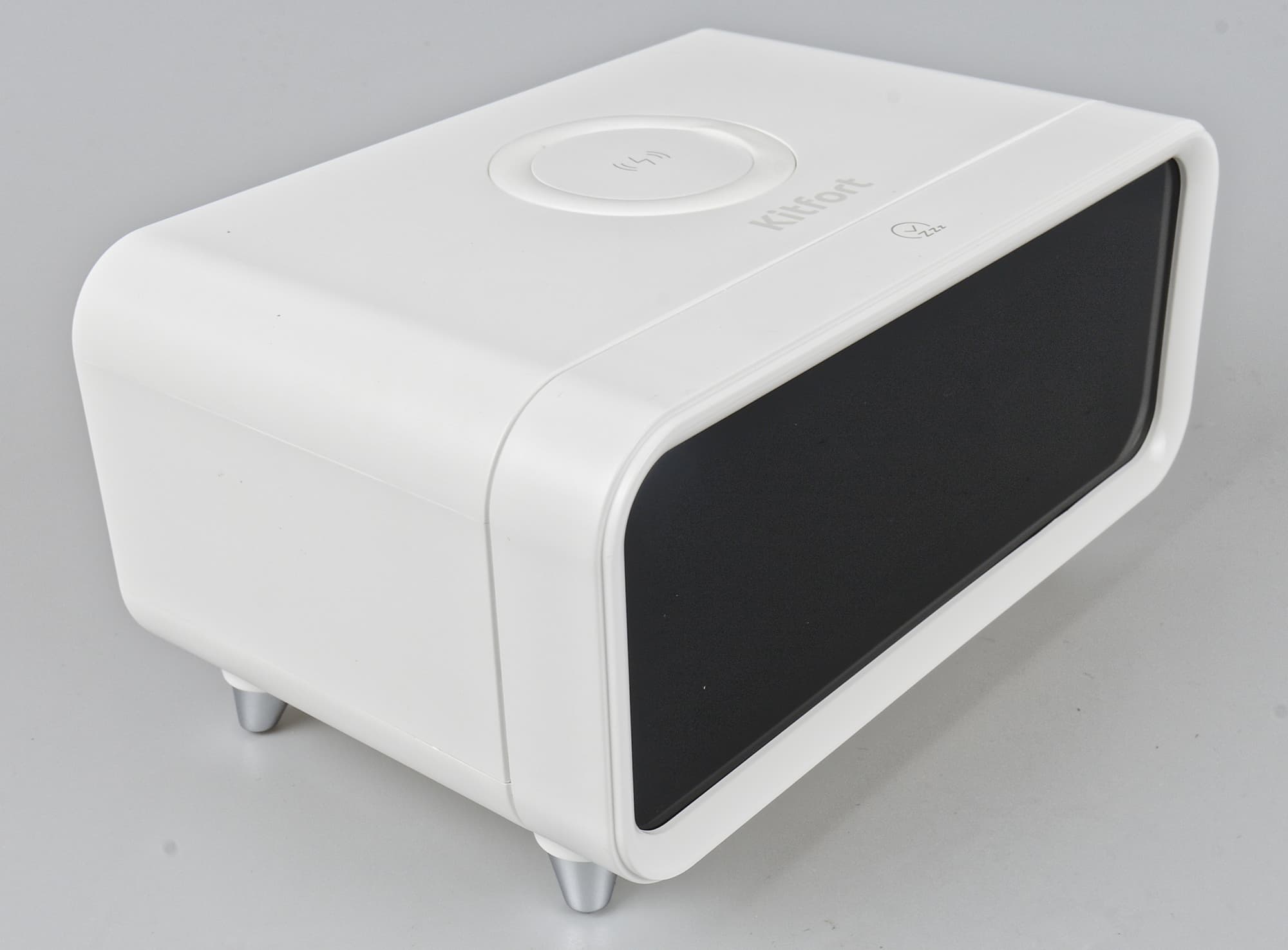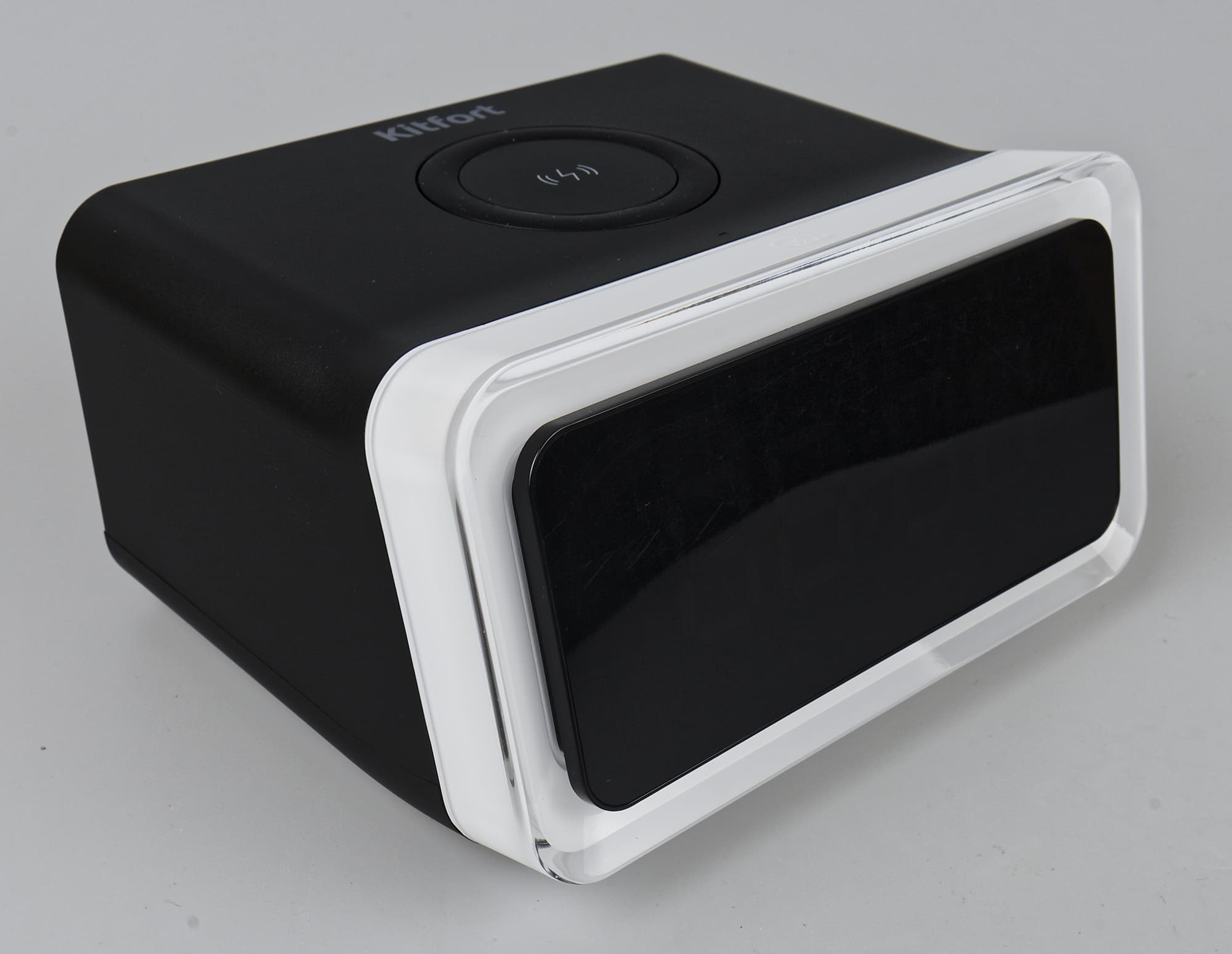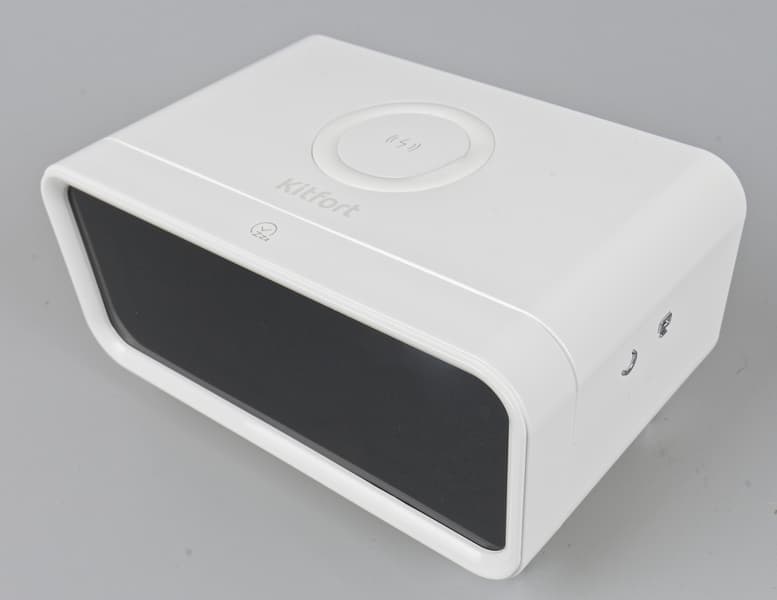 Настольные часы Kitfort KT-3314 имеют существенные отличия от рассмотренных моделей: здесь светодиодная подсветка размещена вокруг дисплея, сам дисплей смотрит немного вверх, а часы способны выступать в роли Bluetooth-колонки и беспроводной зарядки.