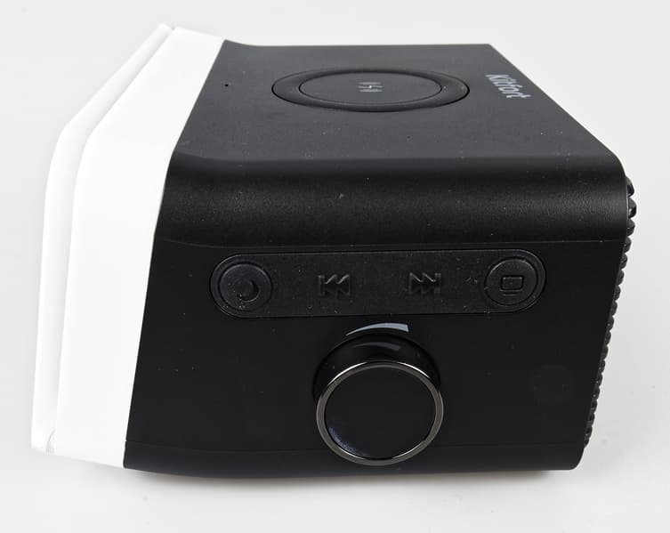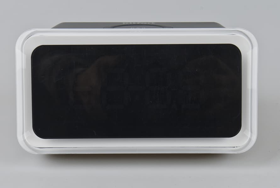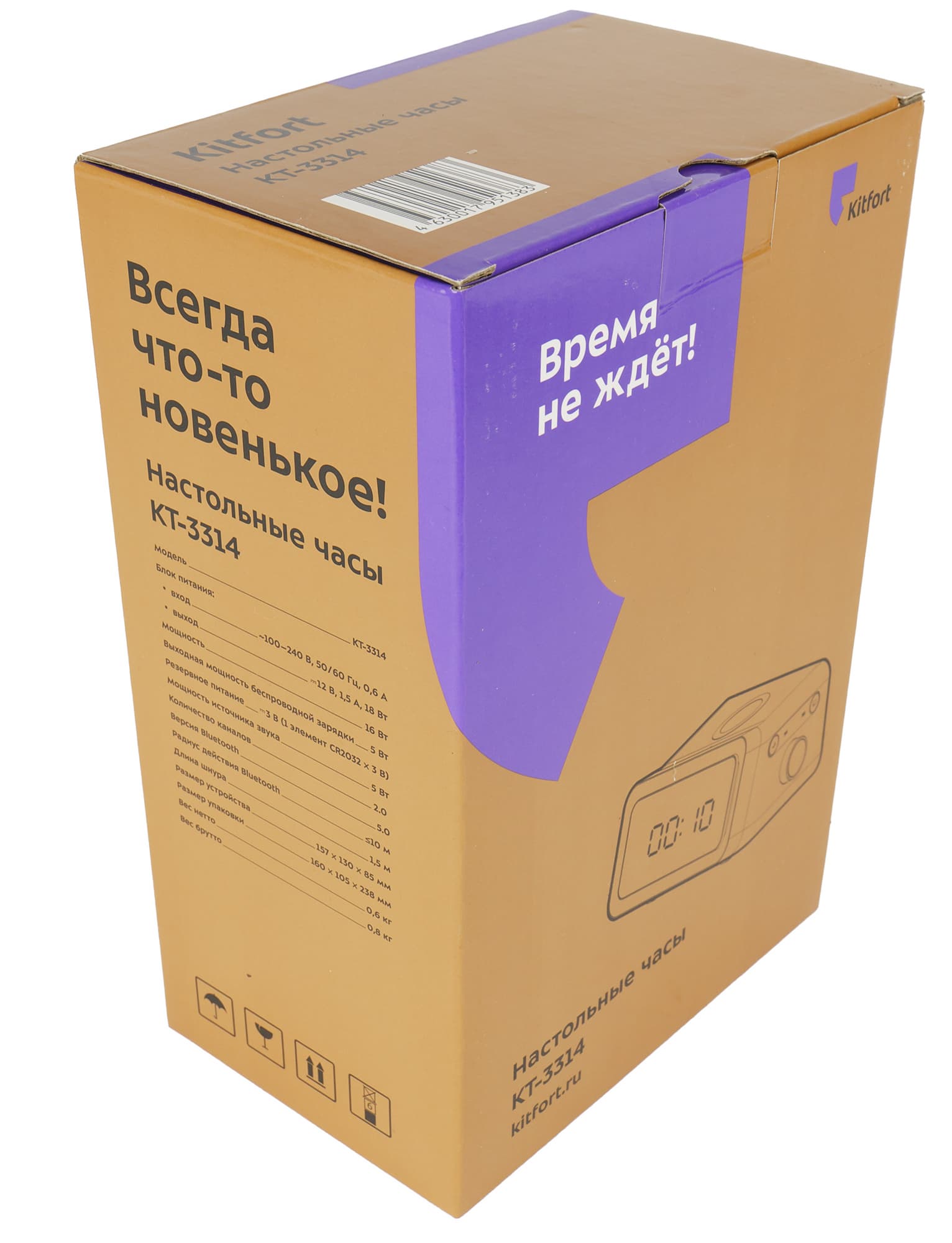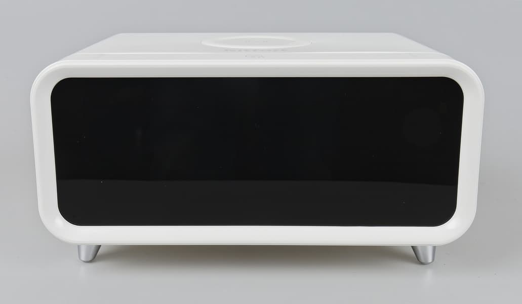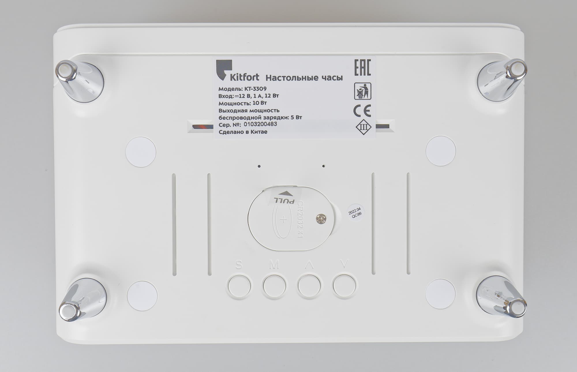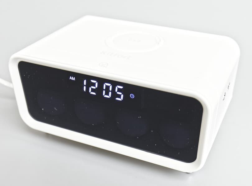 Настольные часы Kitfort KT-3314 имеют существенные отличия от рассмотренных моделей: здесь светодиодная подсветка размещена вокруг дисплея, сам дисплей смотрит немного вверх, а часы способны выступать в роли Bluetooth-колонки и беспроводной зарядки.
