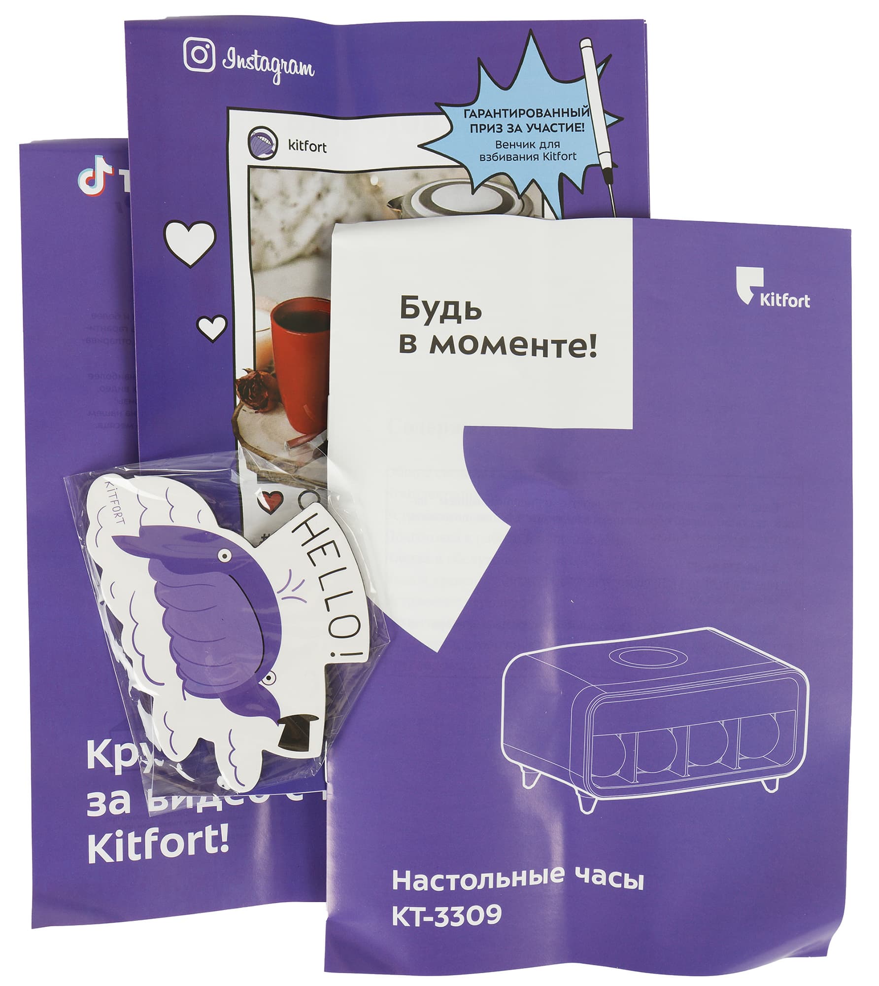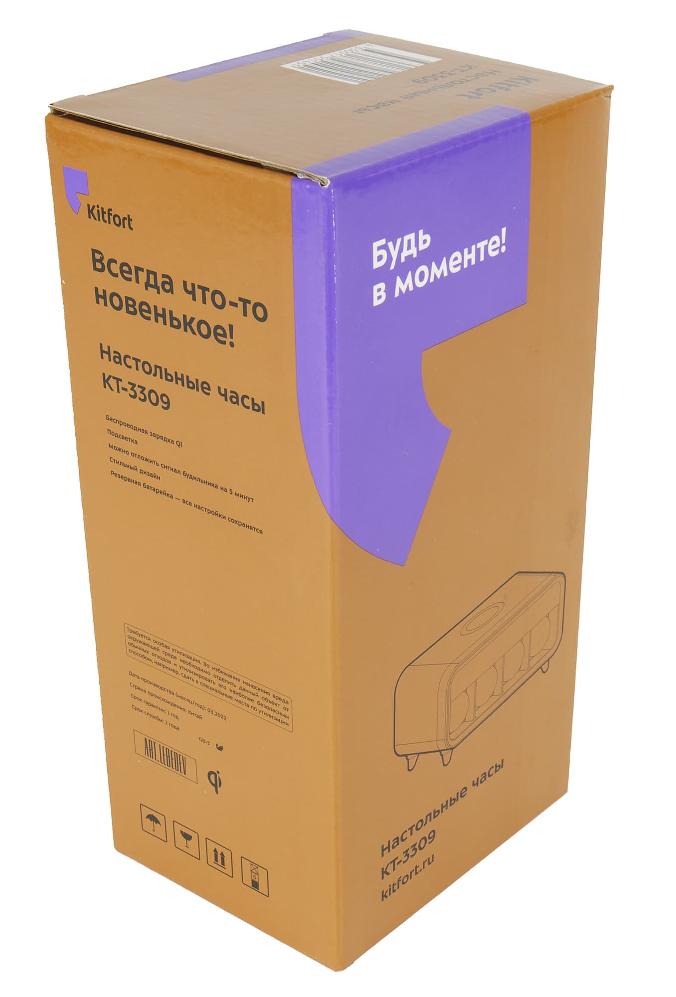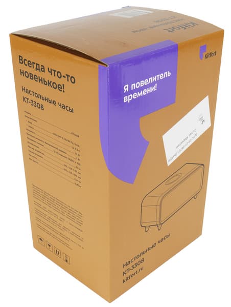 Kitfort KT-3309 поставляется в фирменной картонной упаковке, оформленной в едином стиле Kitfort. На боковых гранях коробки размещены схематические изображения устройства, логотип компании, полное название модели, ее технические характеристики и обязательный логотип, для этой модели — «Я повелитель времени!».