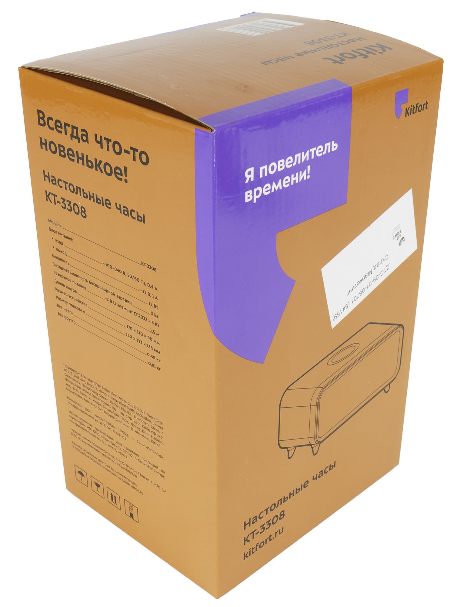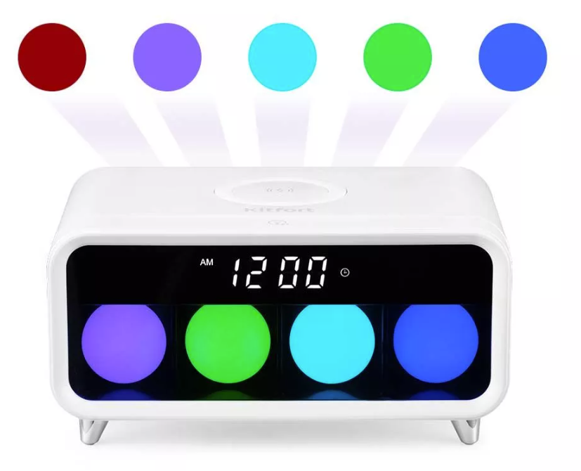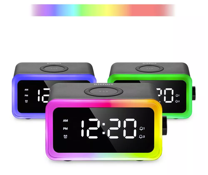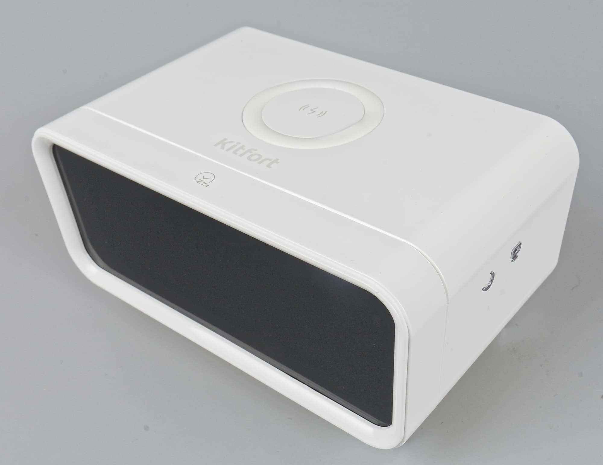Начнем с настольных часов Kitfort KT-3308. Этот небольшой и легкий прибор позволит узнать время, а также вовремя разбудит владельца и зарядит телефон благодаря наличию встроенной беспроводной зарядки.