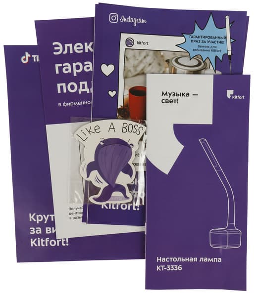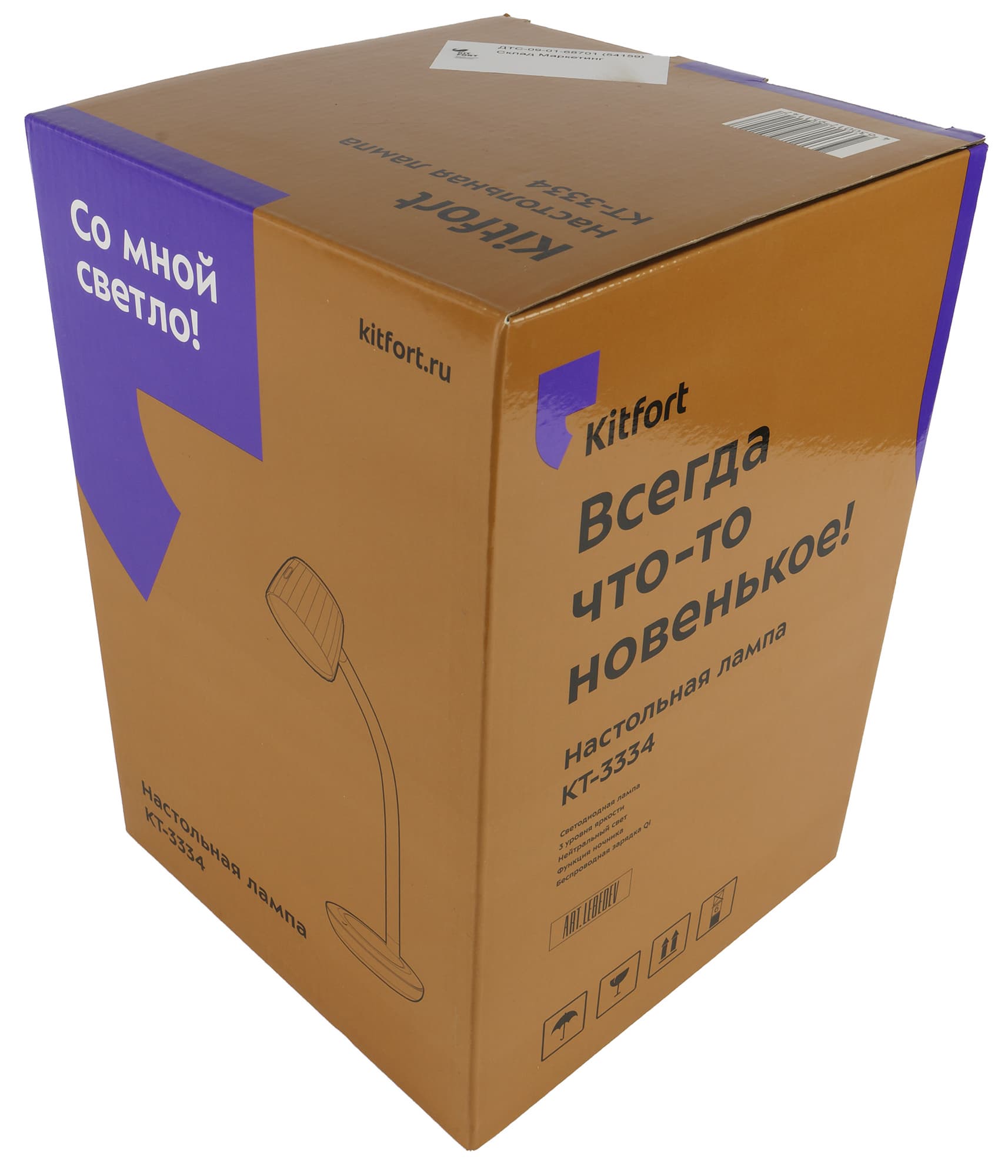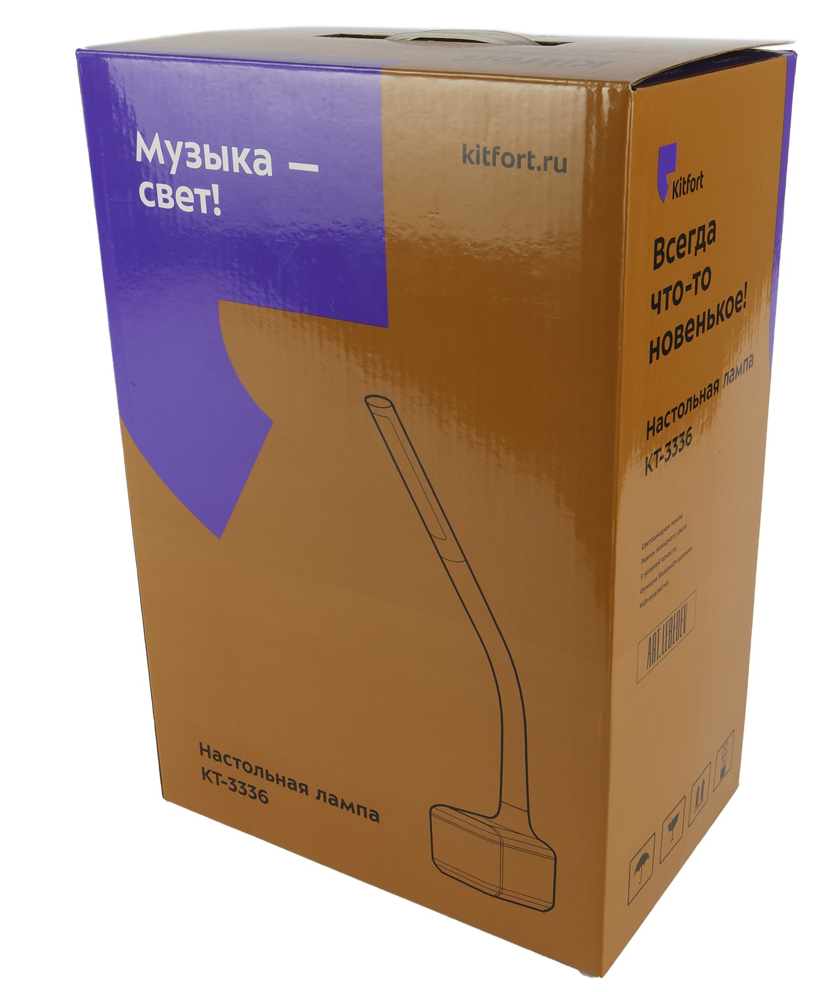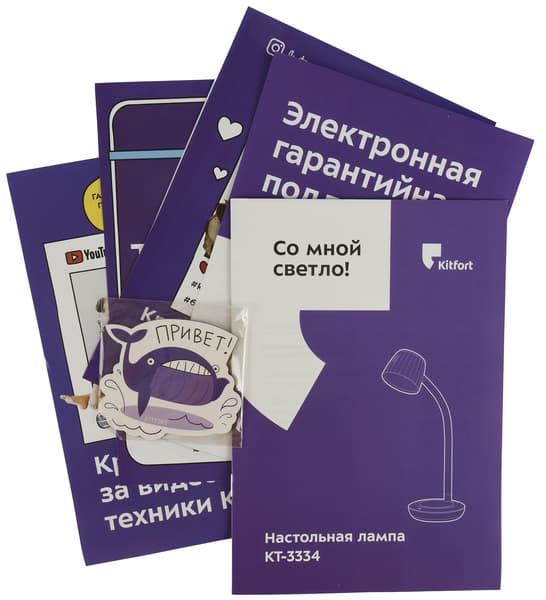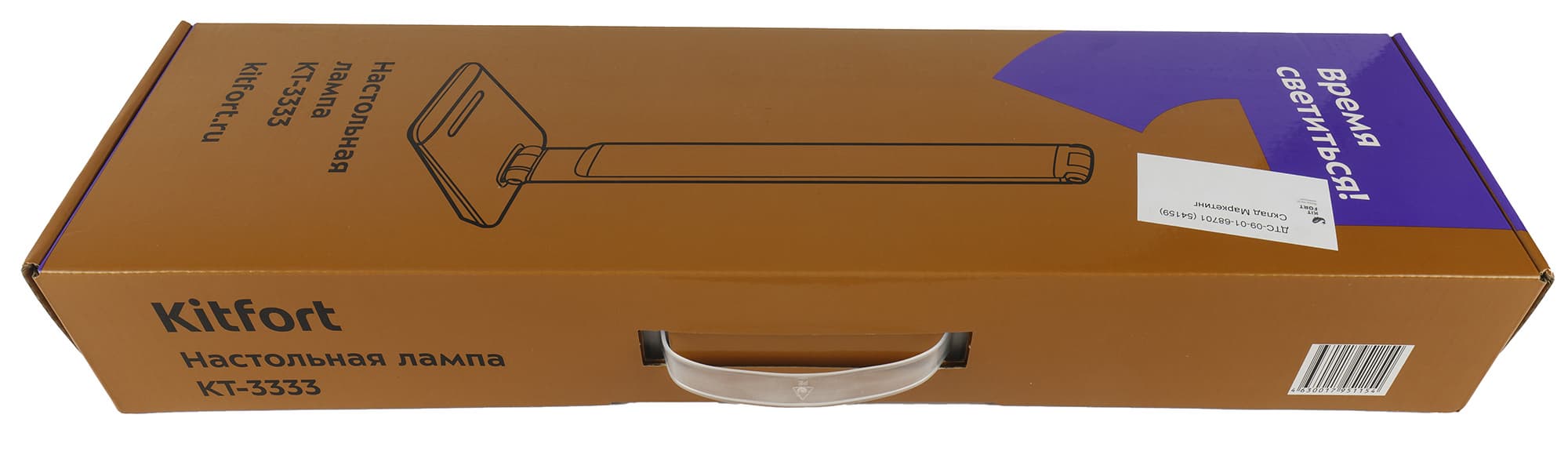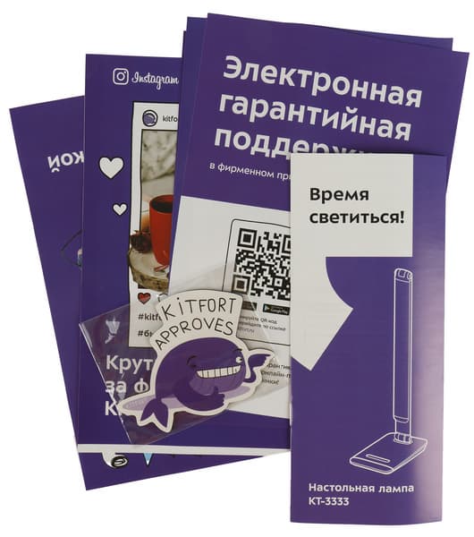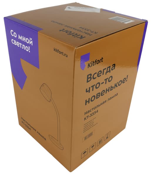 Настольная лампа упакована в картонную коробку с глянцевым покрытием, оформленную в фирменном стиле Kitfort. Сверху на ней нанесено векторное изображение устройства, а также индекс модели, адрес сайта производителя и обязательный слоган — свой для каждого типа продукции. Один из девизов для ламп, как мы видим, — «Время светиться!».
