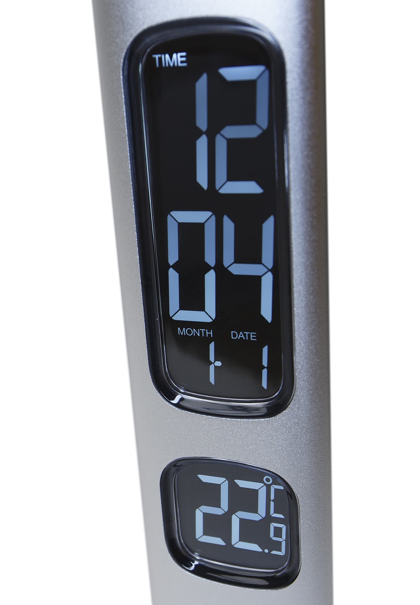 Цифровые светодиодные экраны часов и термометра располагаются на передней стороне нижней стойки. Текущее время, день недели и месяц отображаются на верхнем экране, а температура — на нижнем.