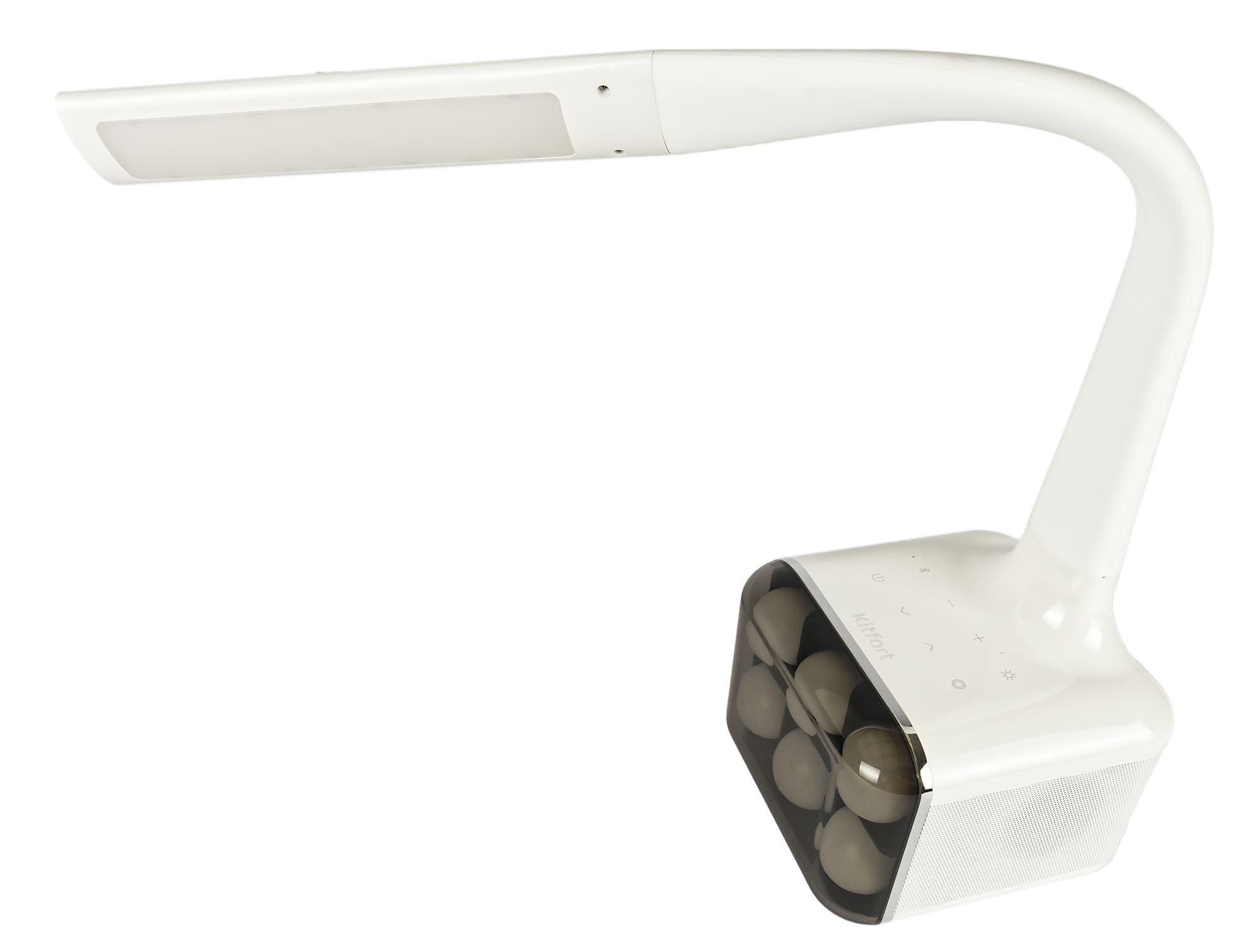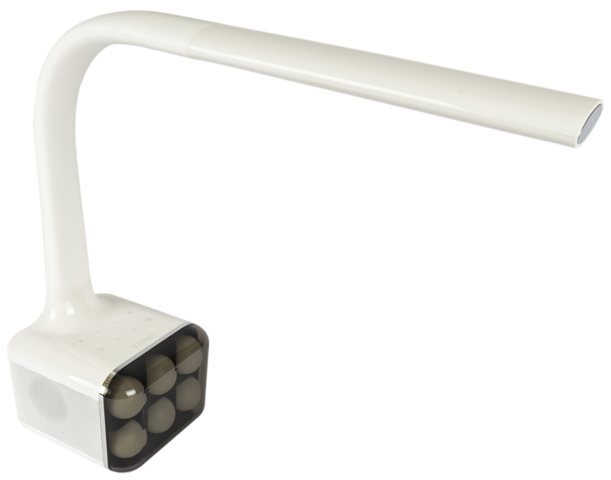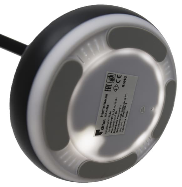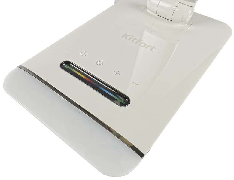 У Kitfort KT-3336 довольно необычная форма. Из почти кубического основания вырастает гибкая штанга овального сечения, заканчивающаяся пластиковым светильником.