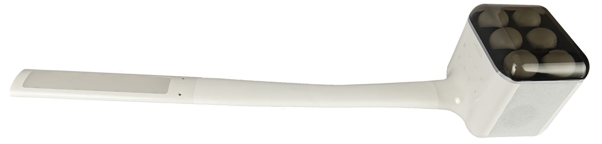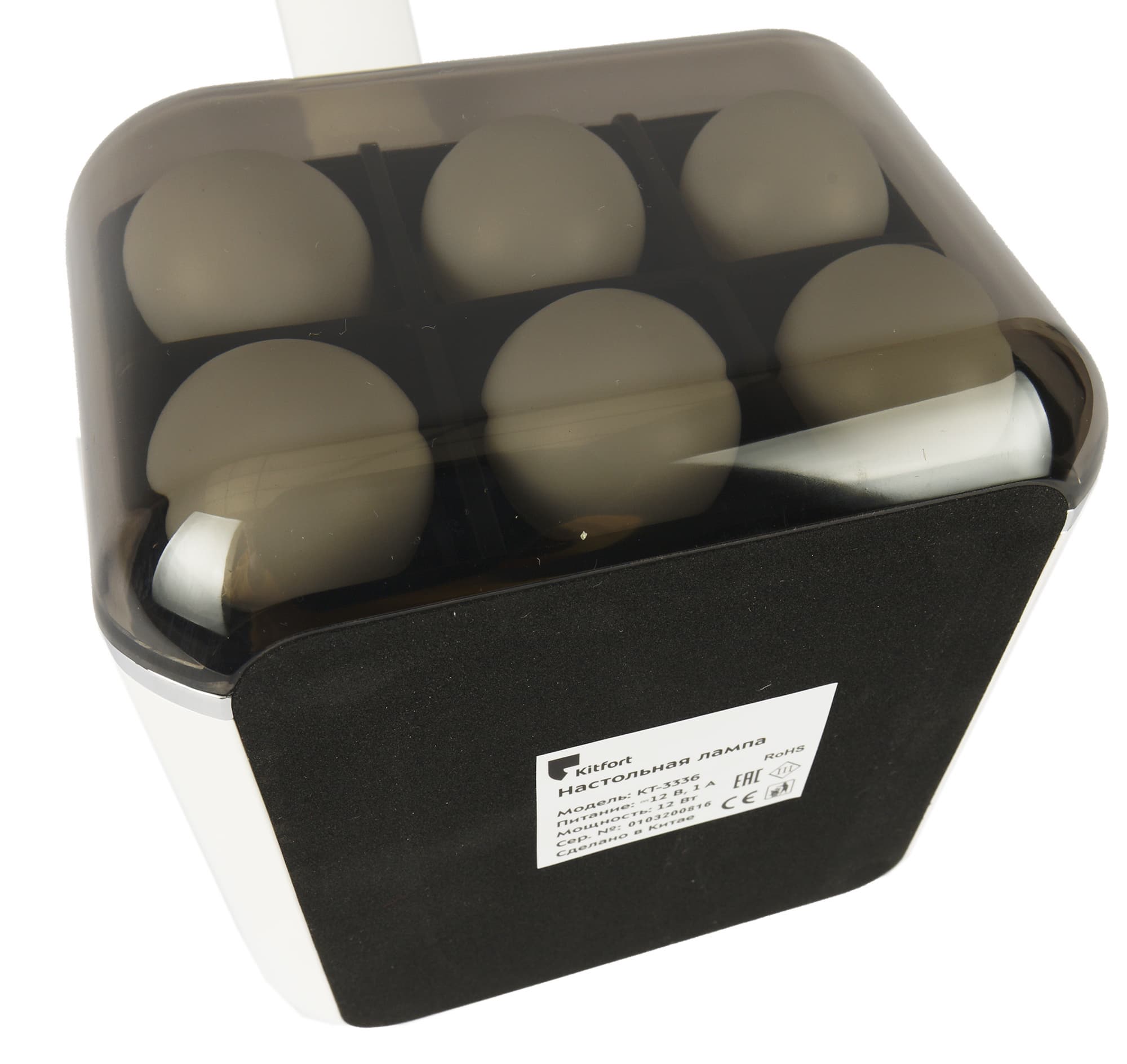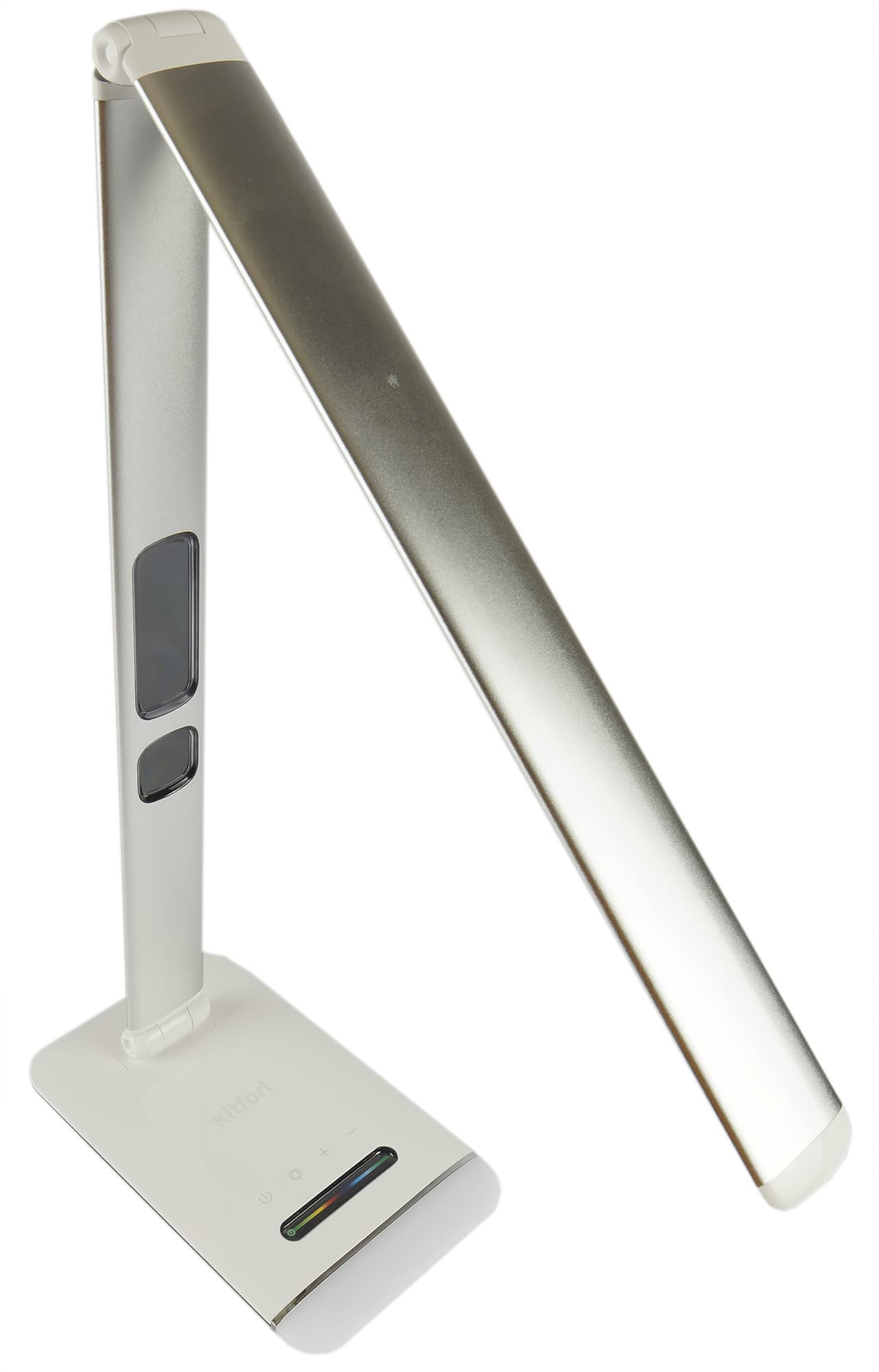 У Kitfort KT-3336 довольно необычная форма. Из почти кубического основания вырастает гибкая штанга овального сечения, заканчивающаяся пластиковым светильником.