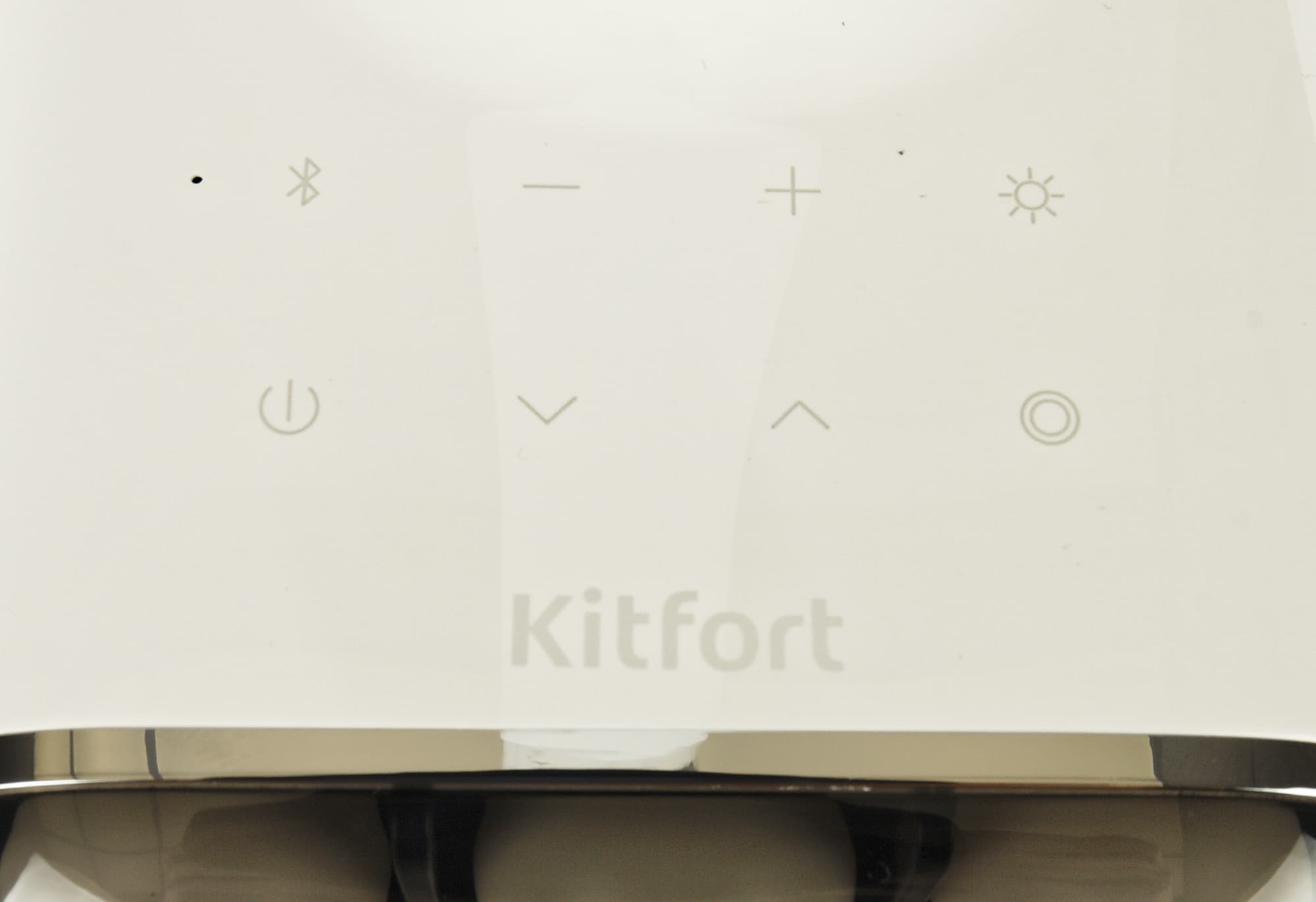 За белым матовым стеклом смонтированы три ряда светодиодов. Как и у Kitfort KT-3333, два крайних ряда горят холодным светом, центральный — теплым, а при выборе нейтрального света зажигаются все три полосы.