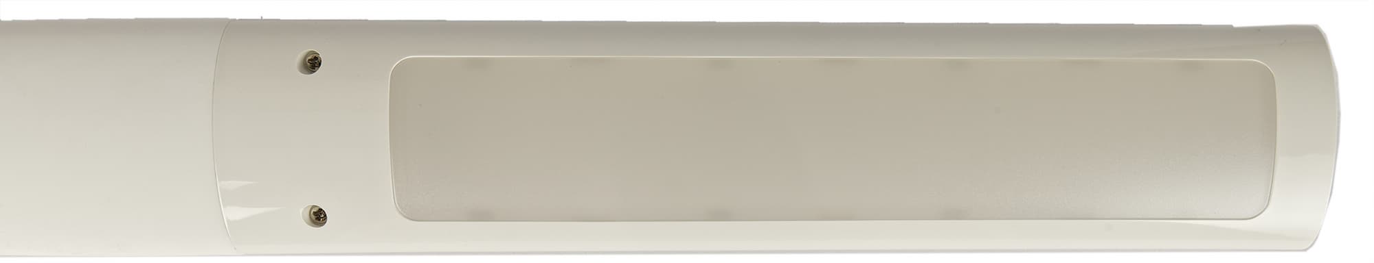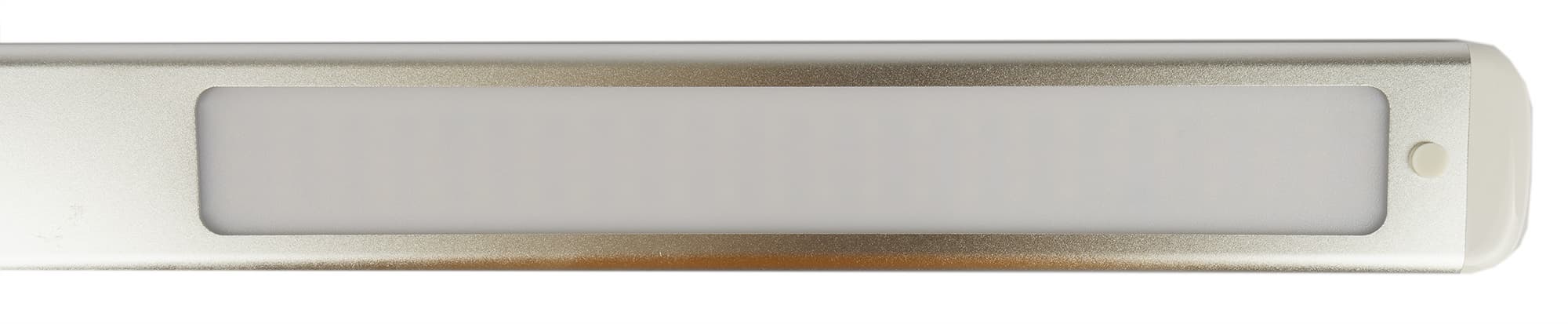 За белым матовым стеклом можно рассмотреть три ряда ярких светодиодов. Два крайних отвечают за холодный свет, у центрального температура теплая, а при выборе нейтрального зажигаются все три полосы. Небольшой амортизатор ближе к торцу защищает конструкцию при полном складывании.