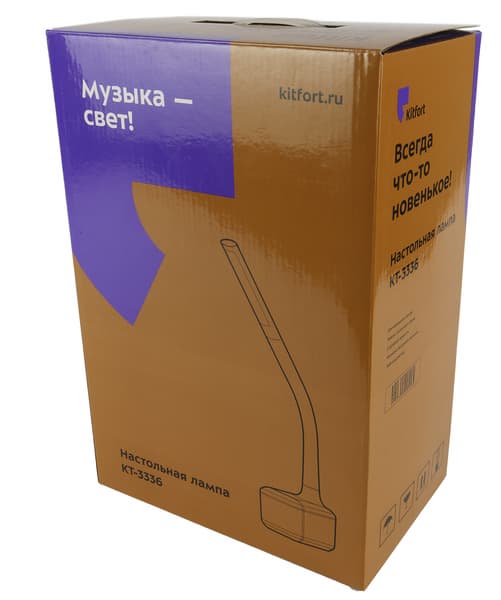 Оформление упаковки уже знакомо нам по коробкам предыдущих моделей: фирменные китфортовские цвета, схематическое изображение устройства и обязательный девиз. Для музыкальной лампы KT-3336 маркетологи подобрали оригинальный слоган «Музыка — свет!».