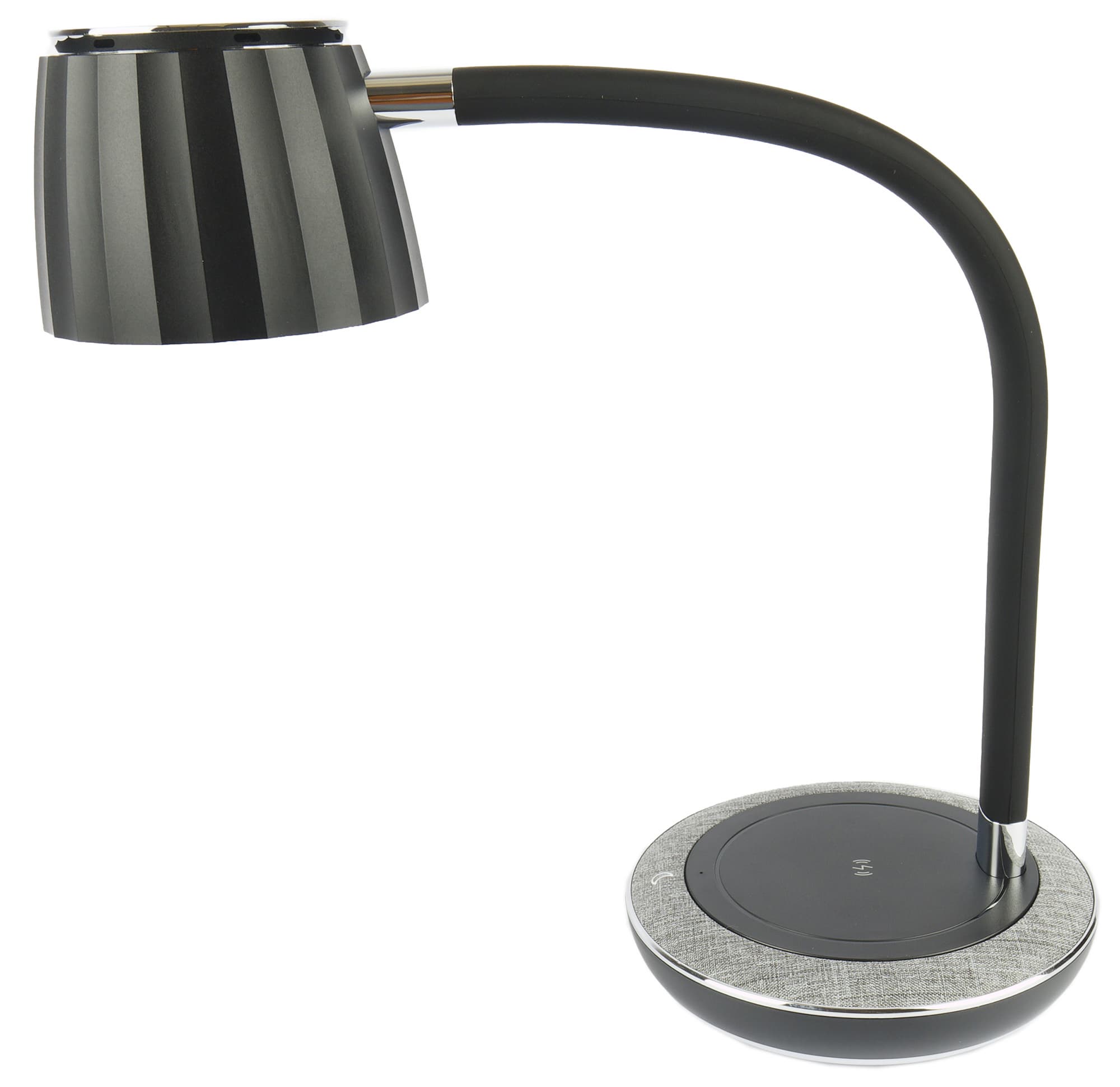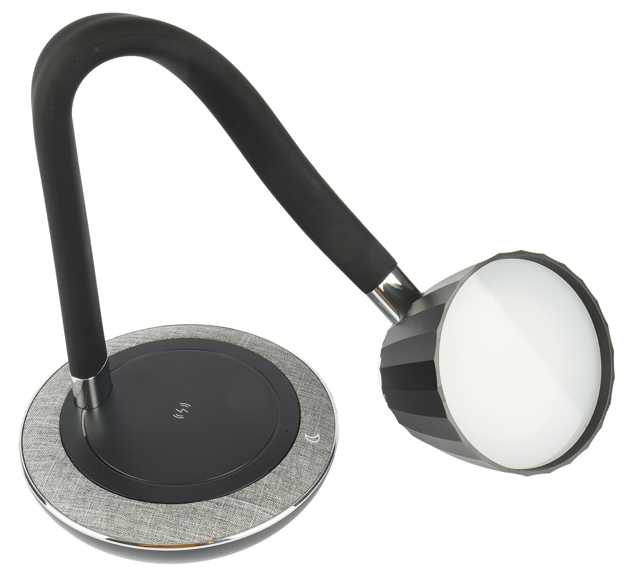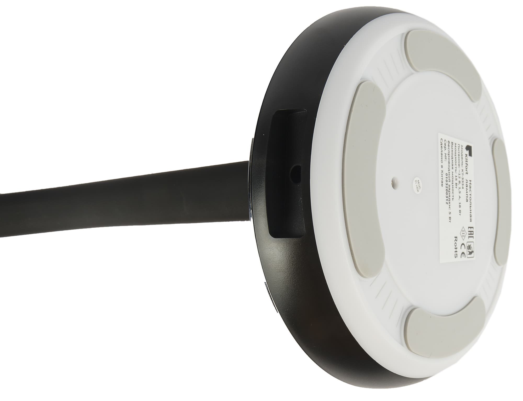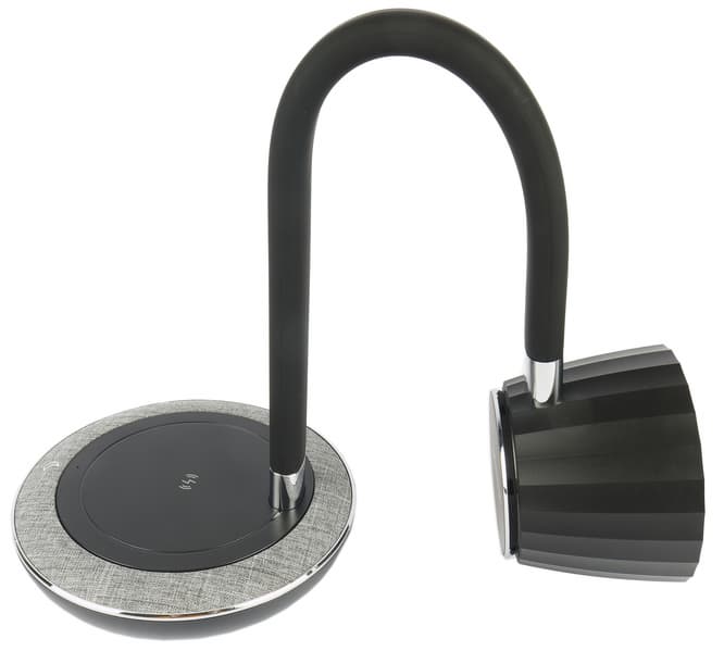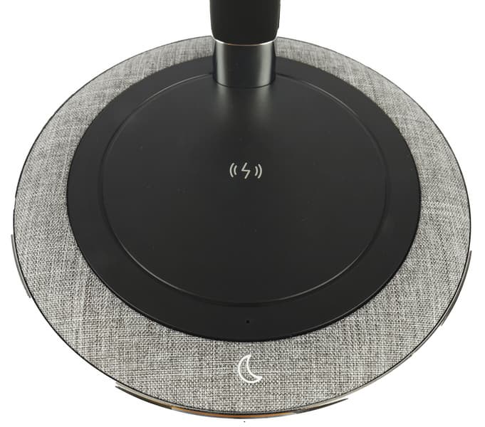 Основание отделано по краю пластиком, текстурой и цветом напоминающим светло-серый лен. Круглая черная площадка в центре представляет собой беспроводную зарядную станцию стандарта Qi, позволяющую заряжать мобильные телефоны, «умные» часы и браслеты, наушники и другие гаджеты.