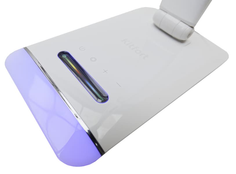 - Сенсоры «меньше» и «больше» регулируют световой поток лампы. Всего у KT-3336 четыре уровня мощности. При выключении лампа запоминает выбранное значение и при следующем старте зажигается с ранее установленной яркостью.