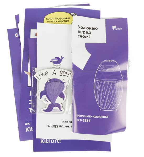 Kitfort KT-3337, KT-3338 и KT-3339 поставляются в фирменных картонных упаковках с глянцевым покрытием. На лицевых сторонах коробок нанесены векторные изображения устройств, а также их наименований, адрес сайта производителя и обязательный слоган — свой для каждой лампы. И все они весьма приятные: «Убаюкаю перед сном!», «Проведем вечер вместе?», «Сладких музыкальных снов!».