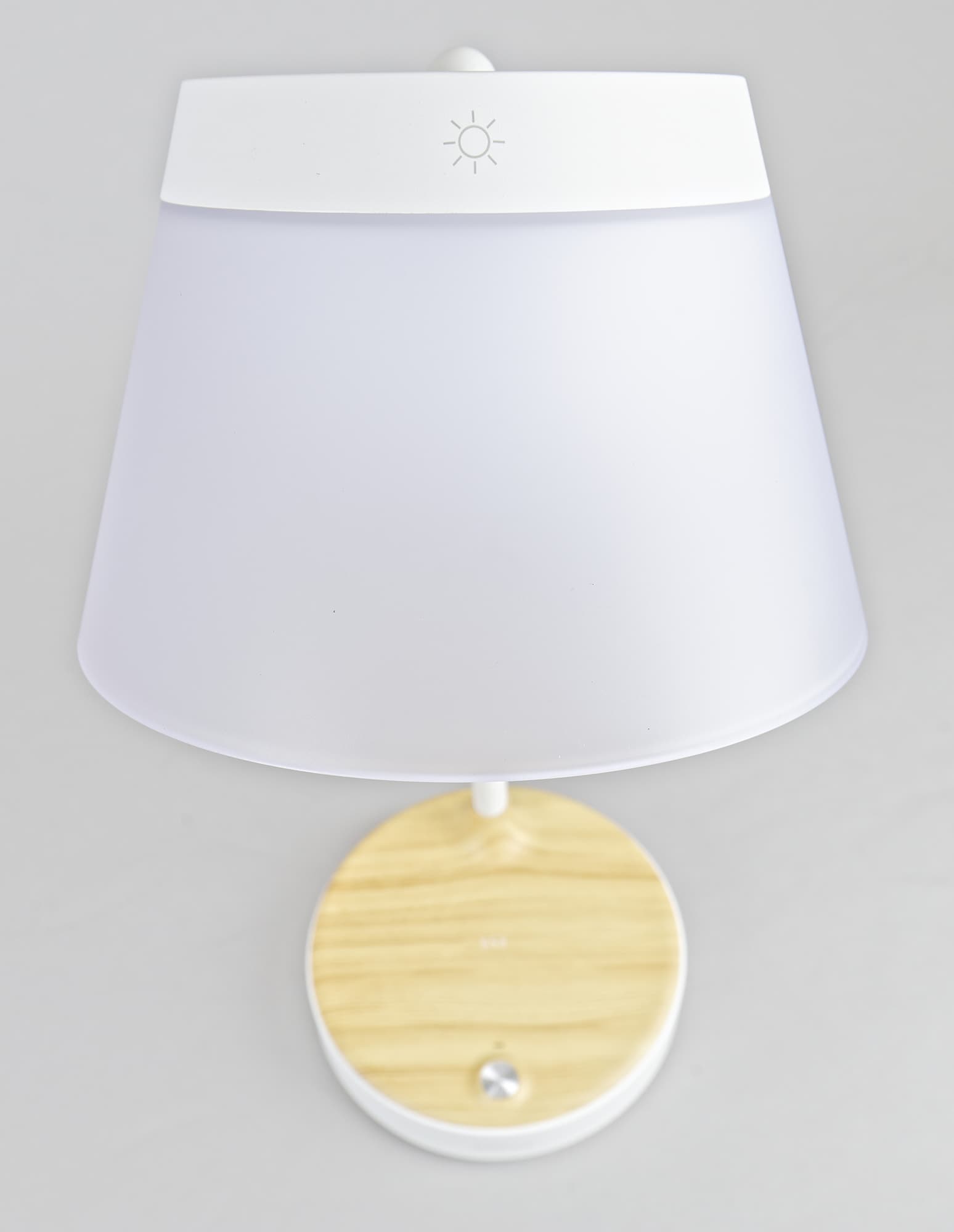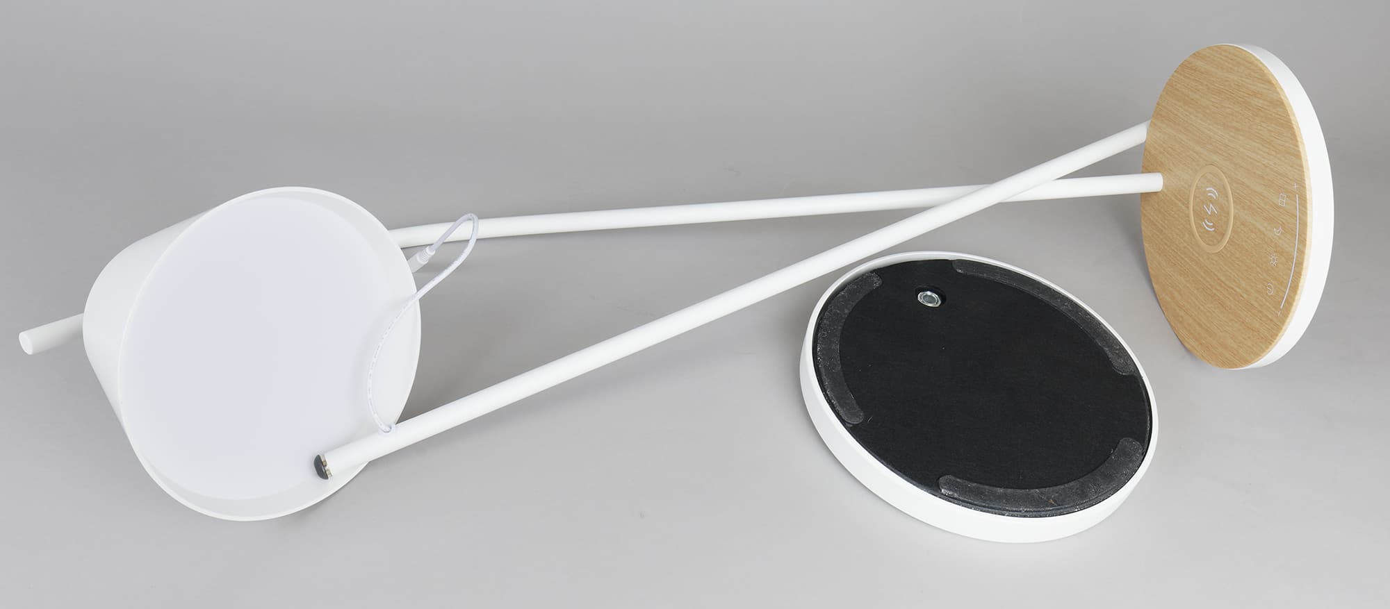 Белый матовый металл основания и штанги ровно, как и матовый белоснежный пластик рассеивателя отлично сочетаются с пластиковой имитацией под светлое дерево круглой панели управления.
