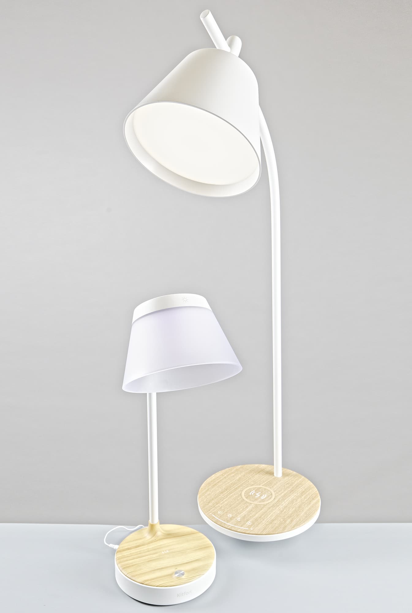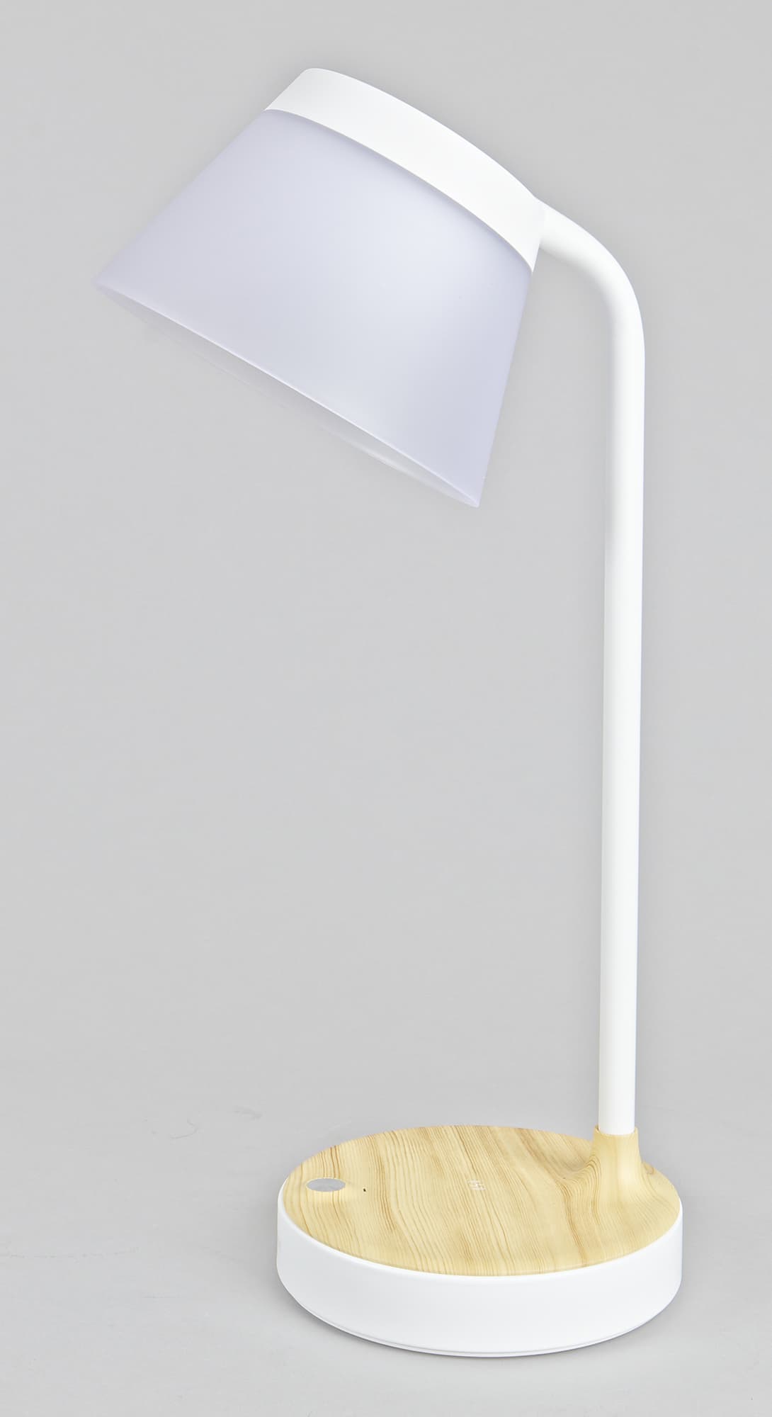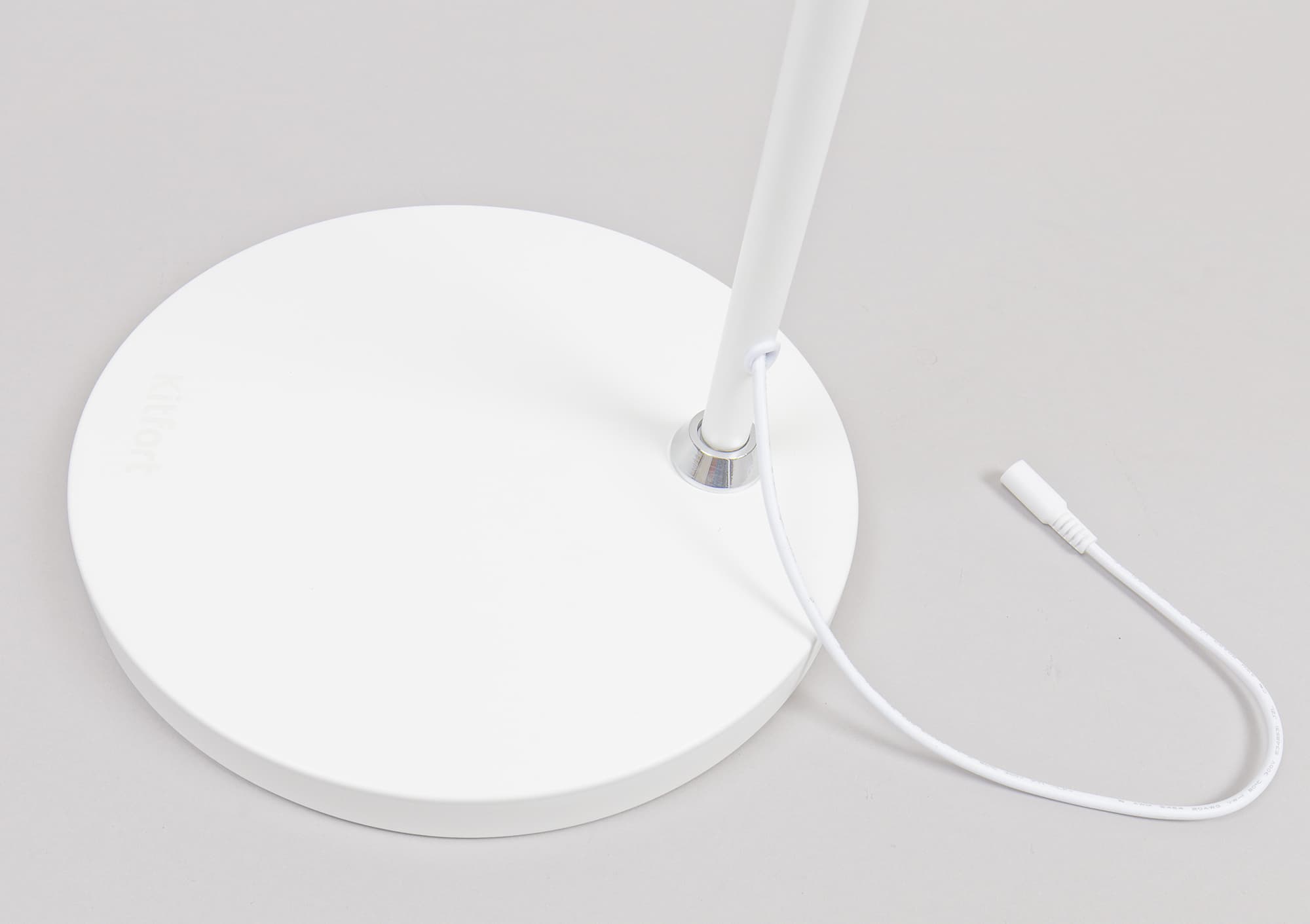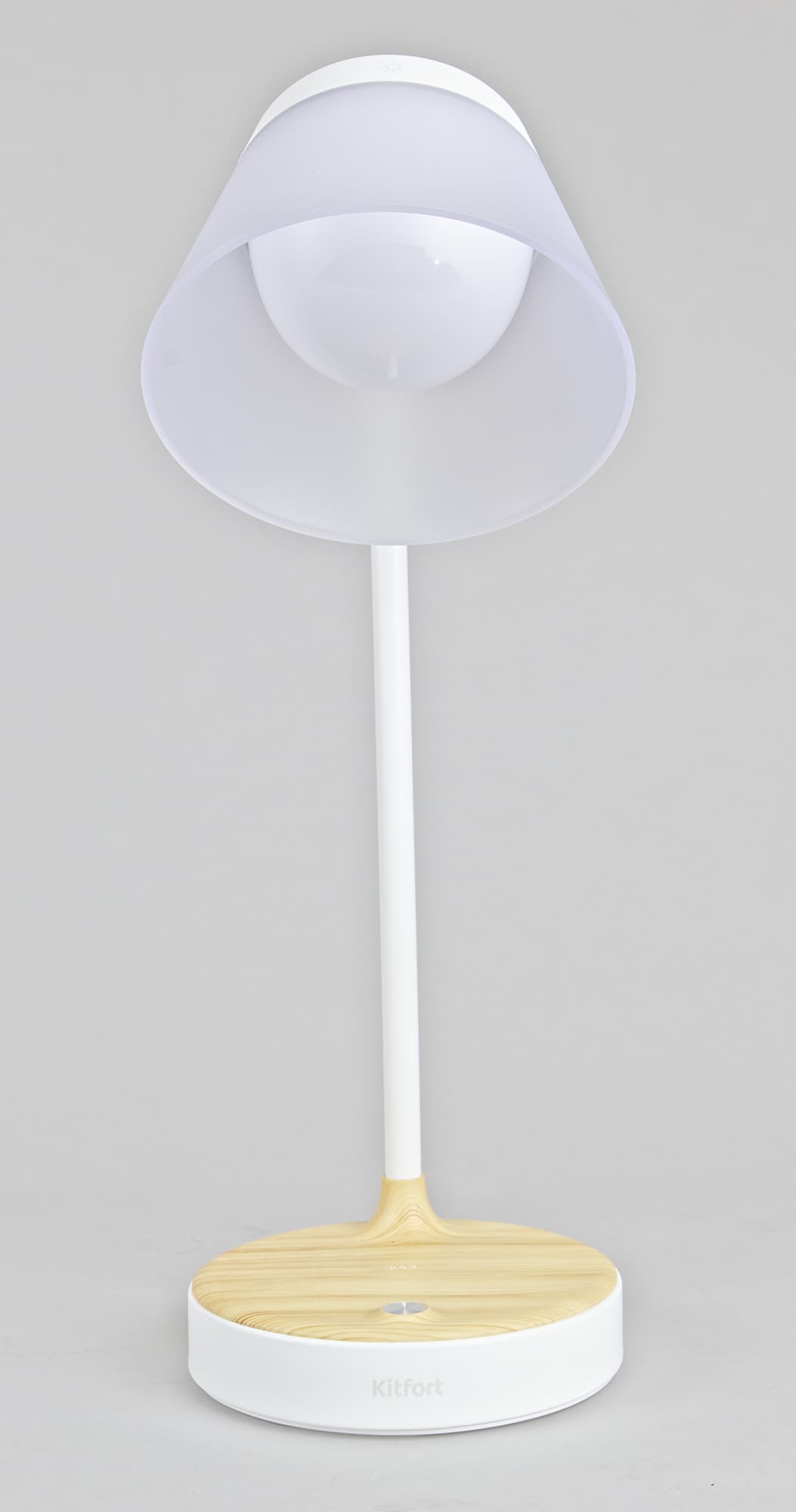 Настольная лампа Kitfort KT-3335 так же хороша, как и ее большой брат. Плавные линии, белый матовый металл плюс пластиковая вставка под светлое дерево — все на радость поклонникам скандинавского стиля и просто минимализма.