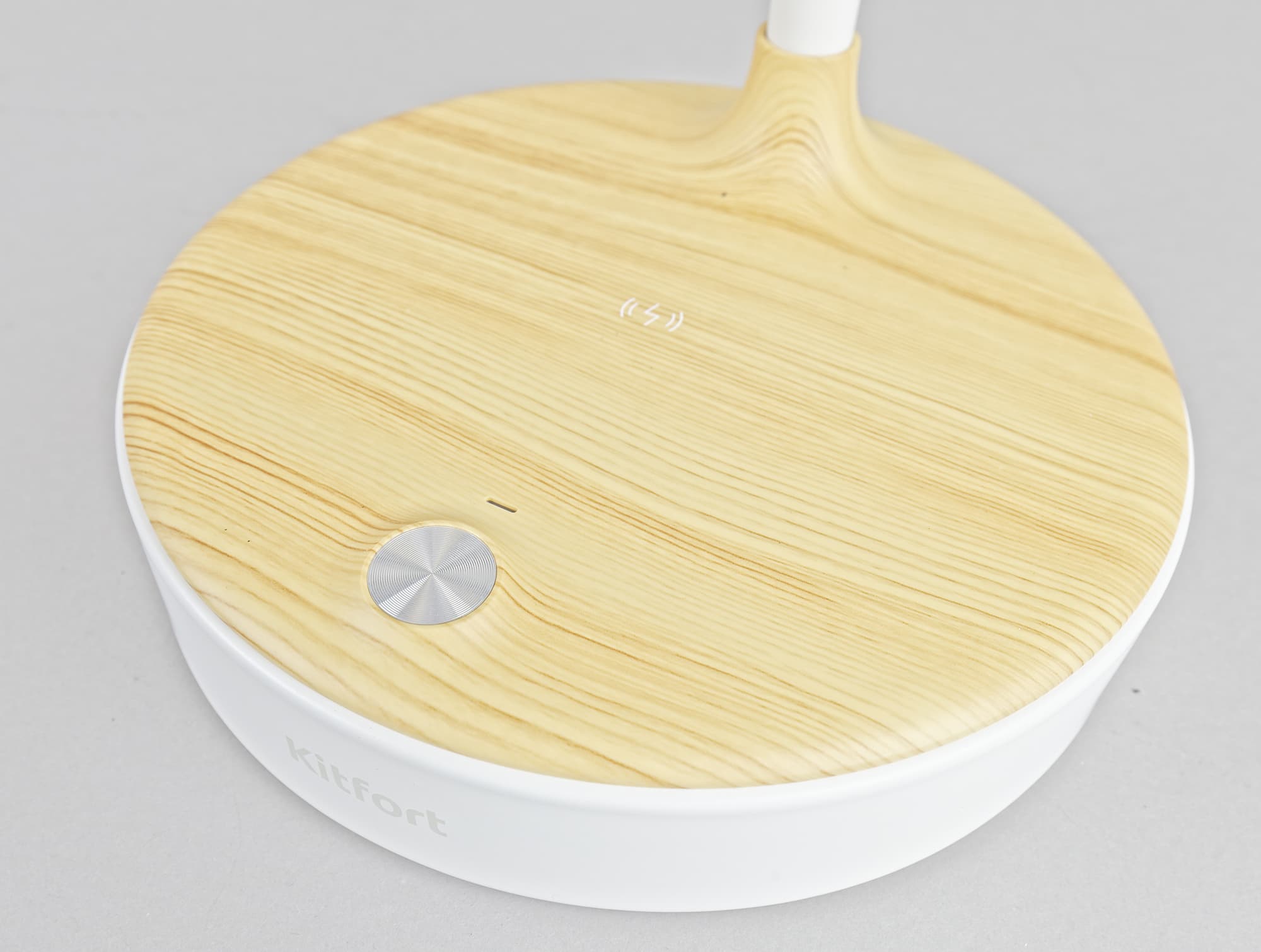 Светодиодная настольная лампа Kitfort KT-3335, как и первая рассмотренная модель, имеет сенсорное управление и оснащена функцией беспроводной зарядки мобильных устройств Qi.