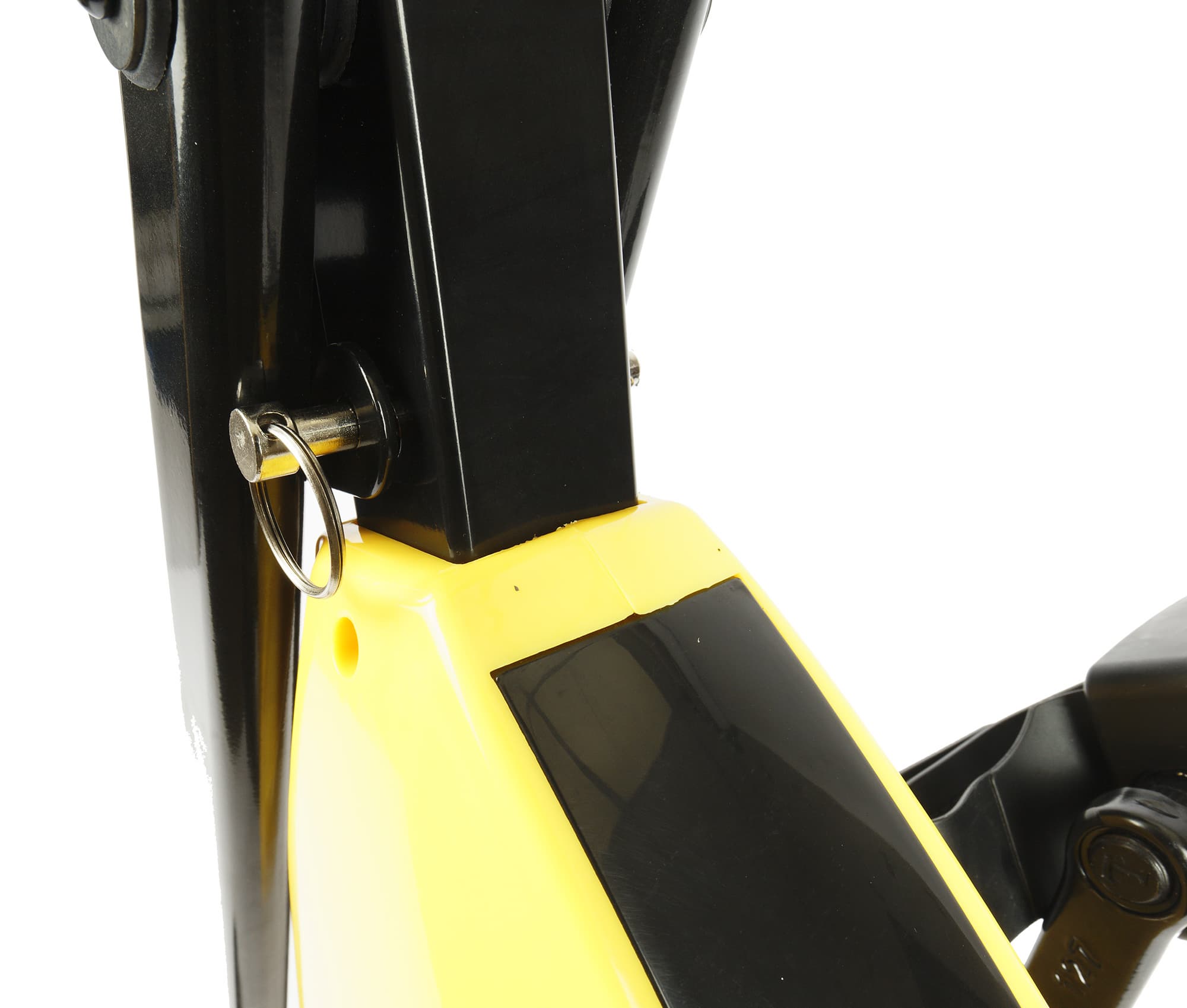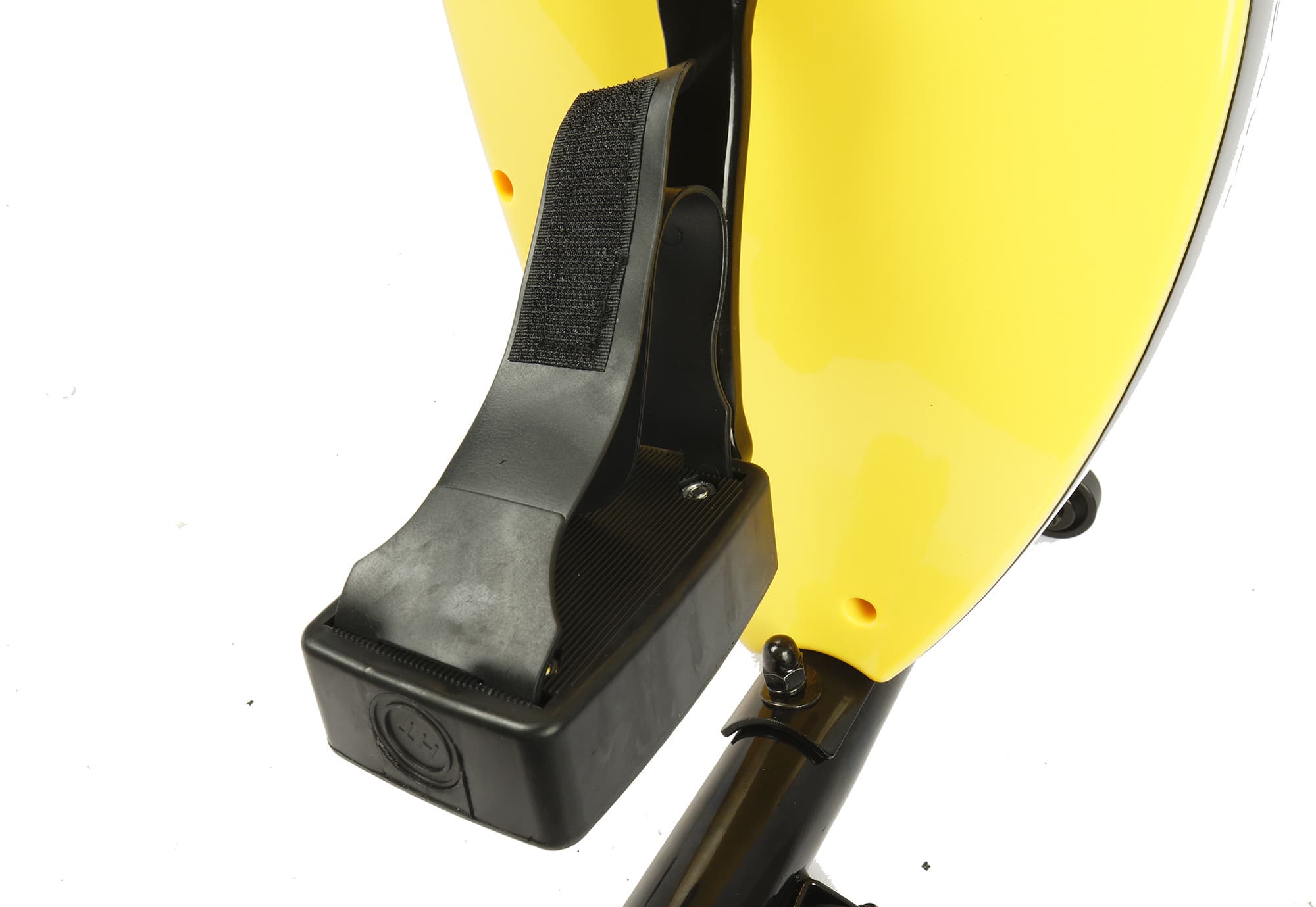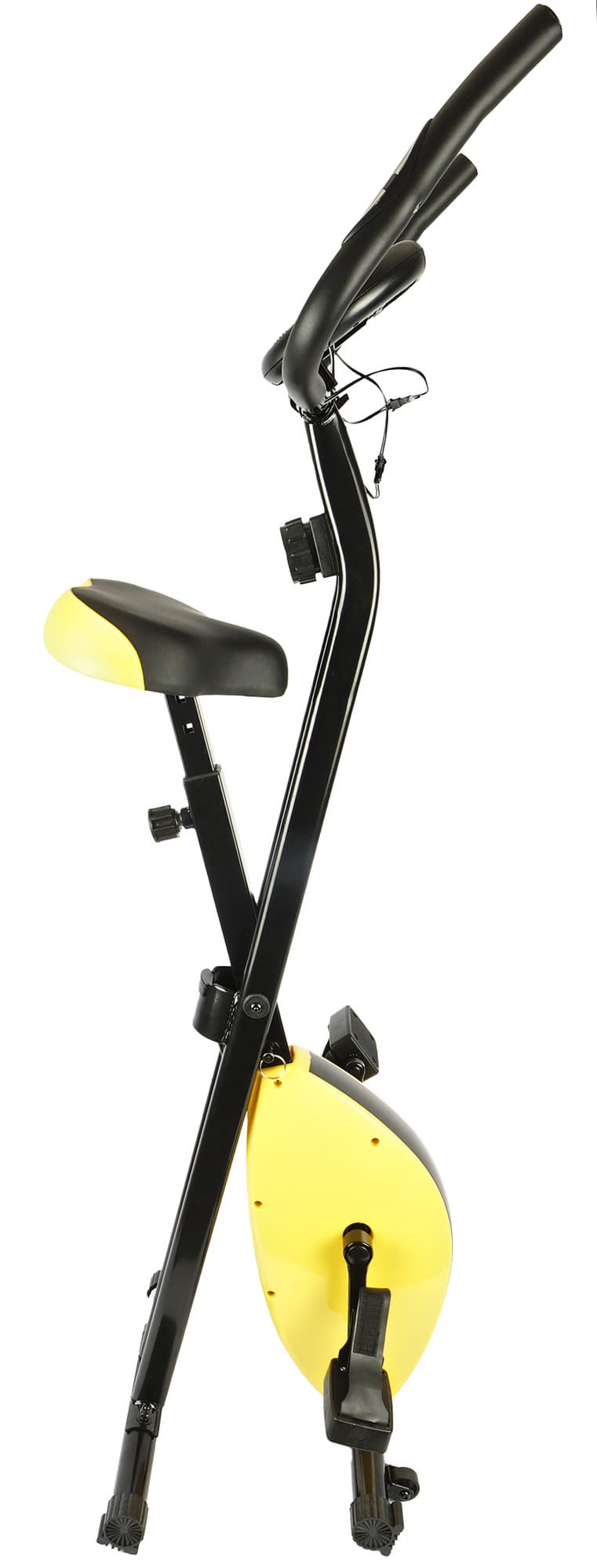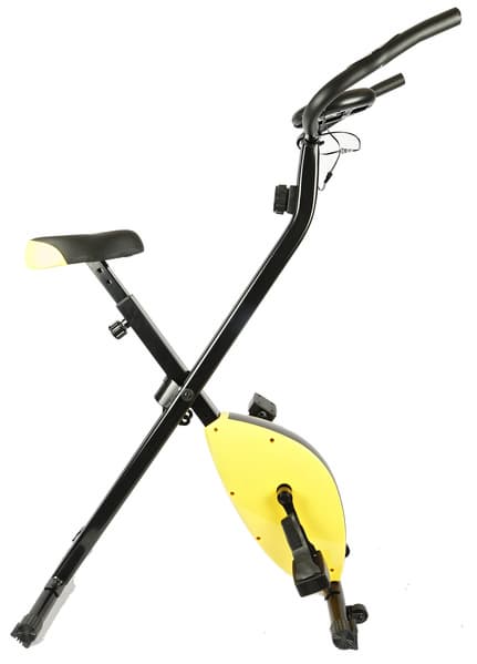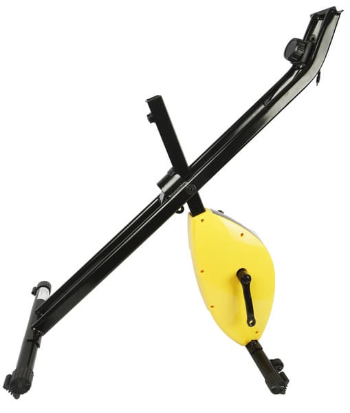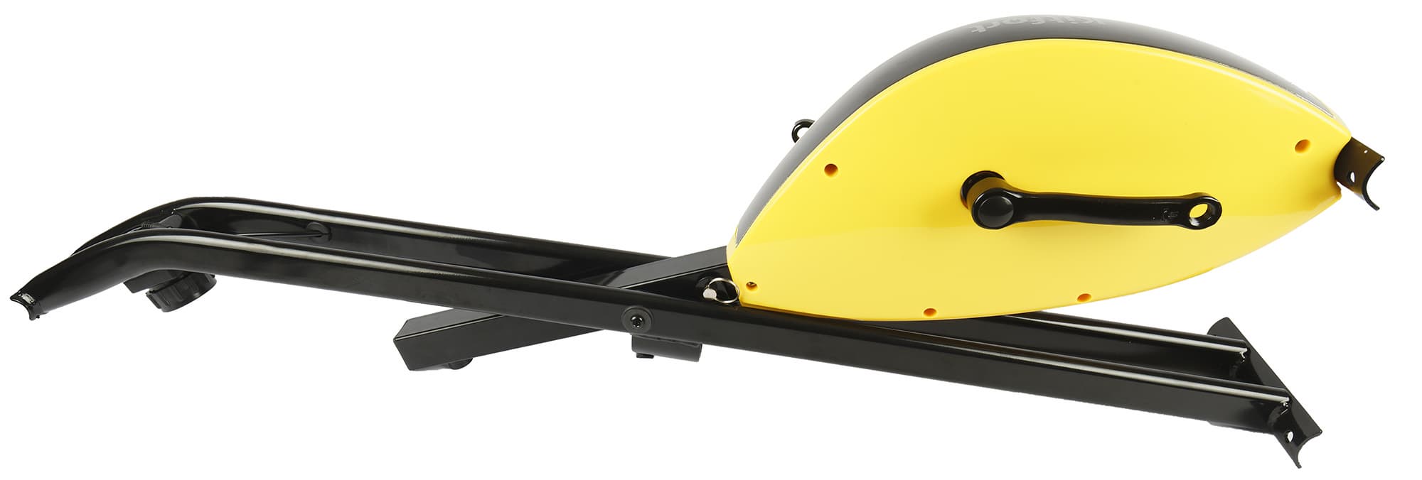 Тренажер производится в черно-желтой гамме и поставляется в разобранном виде. Массивная складная рама сварена из стали и окрашена в черный цвет. Корпус маховика сделан из пластика.