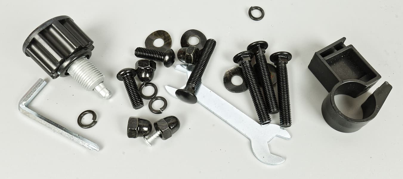 В комплект крепежа входят ручка для регулировки седла, винты для соединения ножек и руля с рамой, шайбы и гайки. К устройству прилагаются также два ключа — шестигранный и рожковый. Последний сделан из очень мягкого сплава и не слишком пригоден даже для однократной сборки: его губки расходятся даже от небольшого усилия на первой же затяжке. Мы рекомендуем сразу отправить его в мусорное ведро и воспользоваться настоящим рожковым ключом 13/15. Менее удобной заменой окажутся пассатижи или небольшой разводной ключ. Также при сборке будет полезной крестовая отвертка.