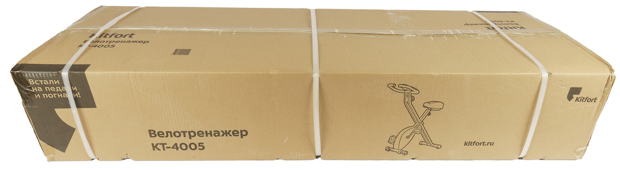Тренажер поставляется в длинной коричневой картонной коробке, усиленной капроновыми стропами. Она оформлена в фирменном стиле Kitfort: на лицевой стороне — векторное изображение устройства, индекс модели и непременный оптимистический слоган, свой для каждого класса техники.