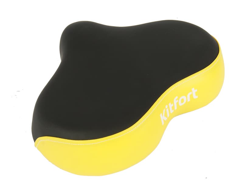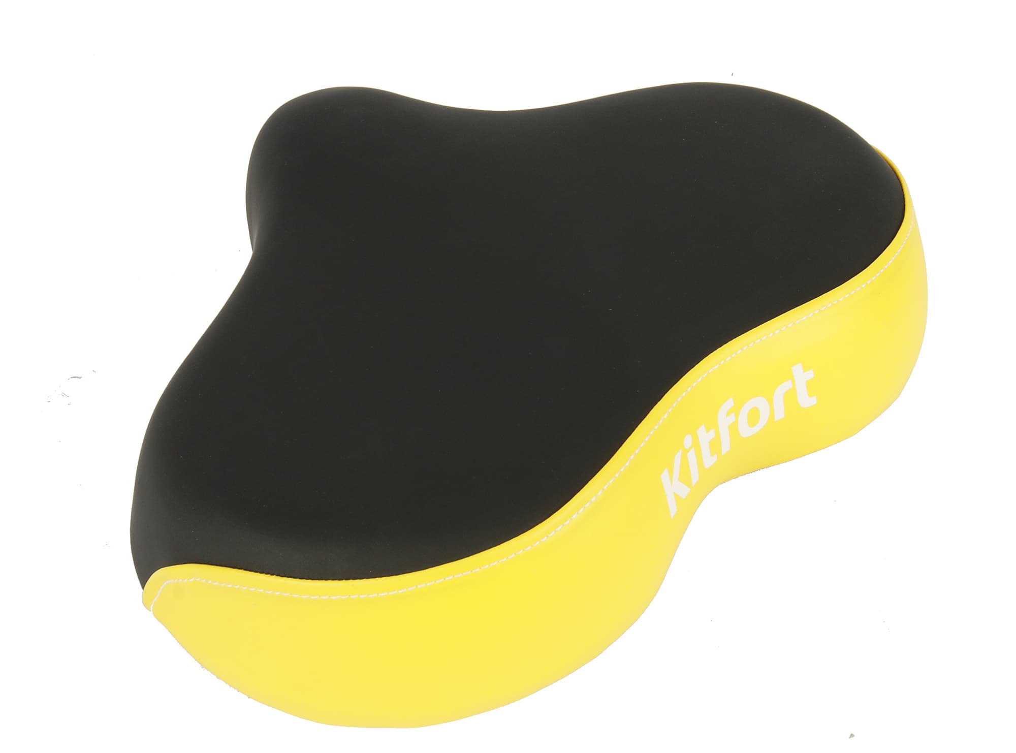 Широкое и мягкое седло обтянуто экокожей двух цветов и украшено логотипом производителя. Его форма и жесткость полностью повторяют типичное «диванное» седло прогулочного велосипеда: при вертикальной посадке основной вес райдера приходится на ягодицы, а ноги полностью разгружены.