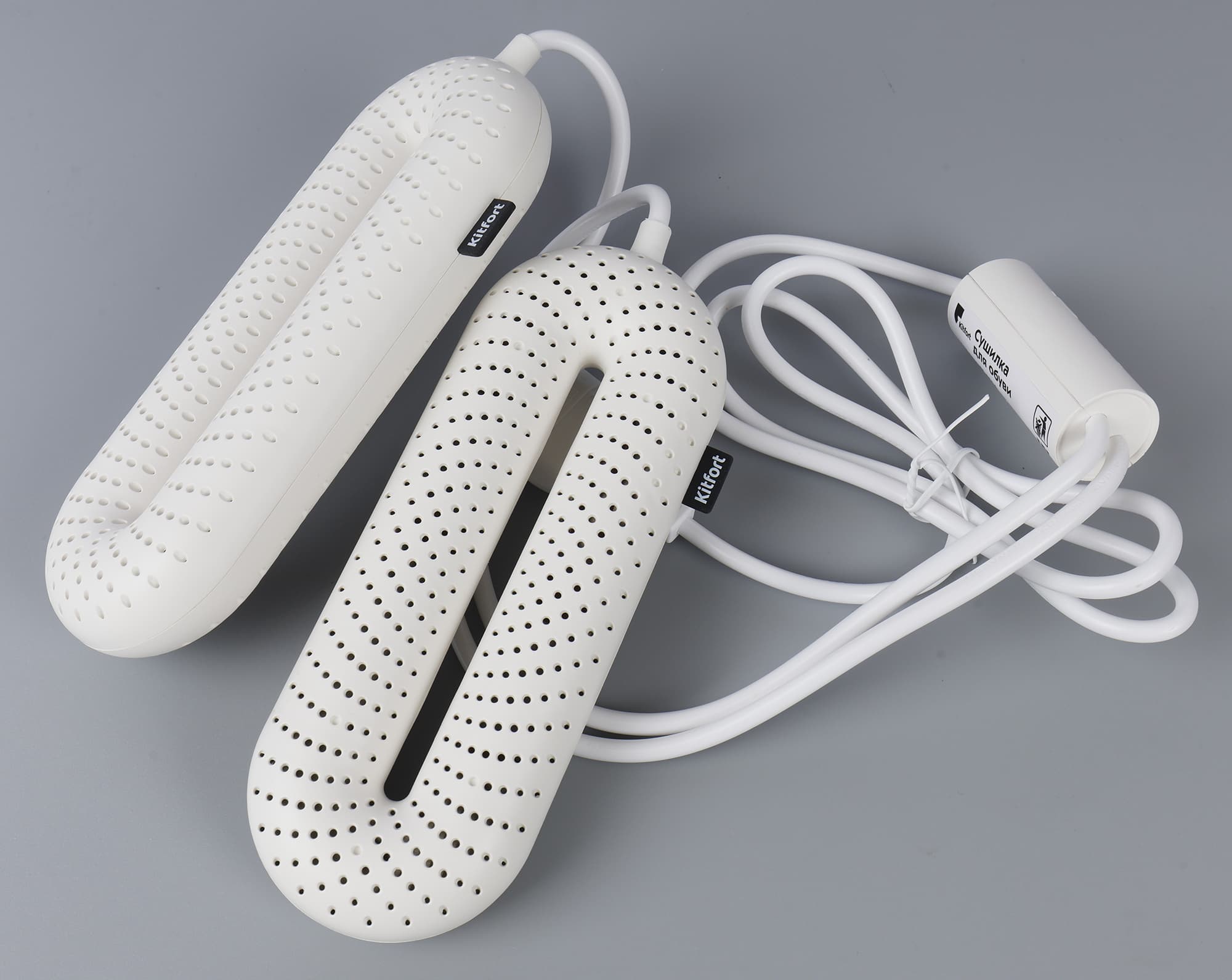 Сушилка для обуви KT-4014 состоит из двух округлых элементов из белого, приятного на ощупь матового пластика. Их соединяет электрошнур средней толщины.