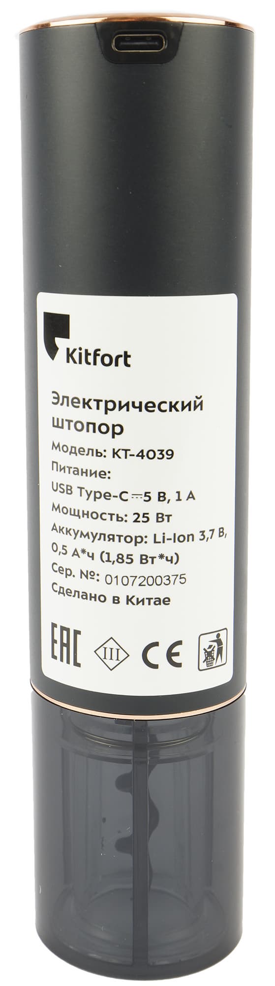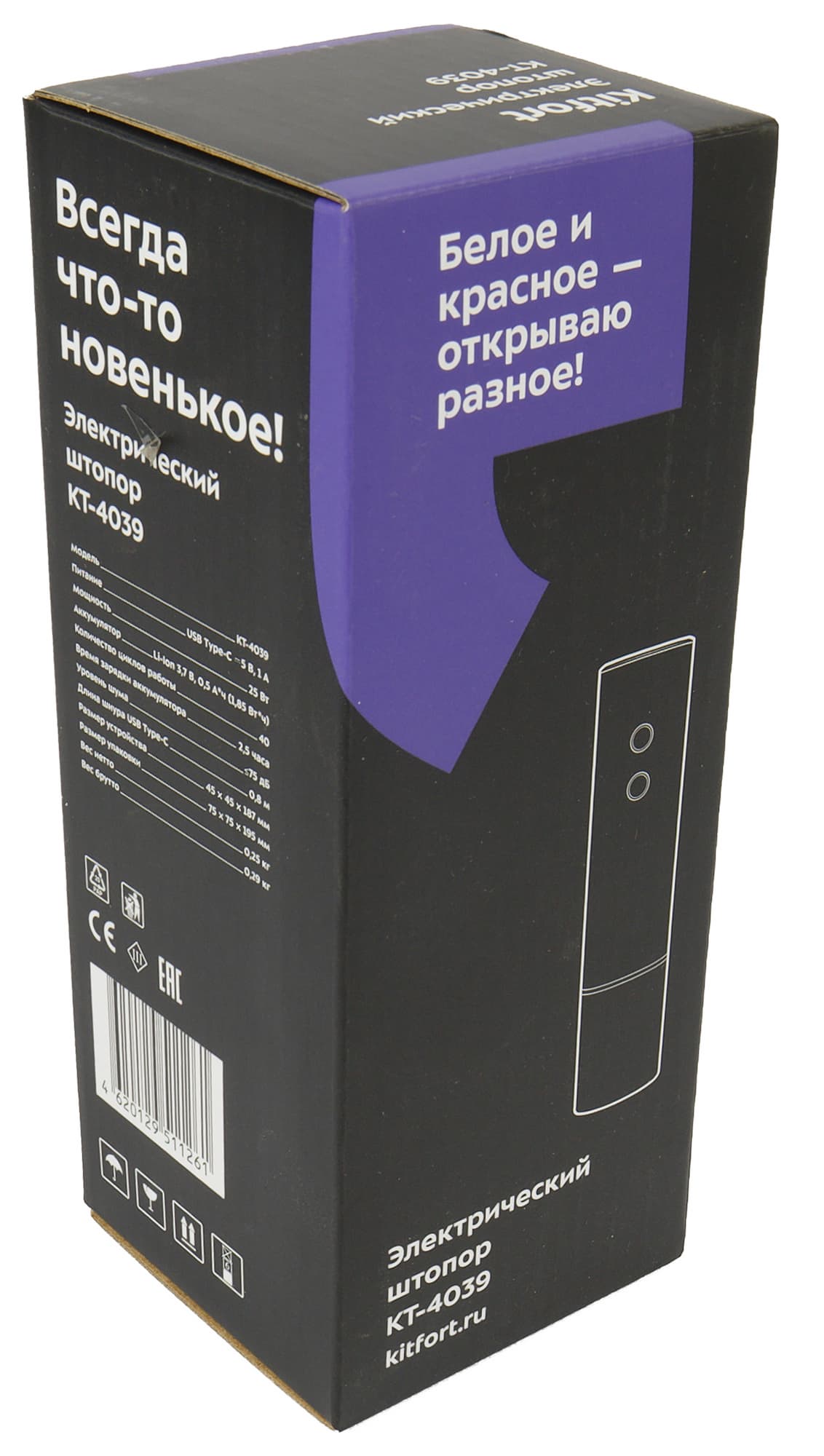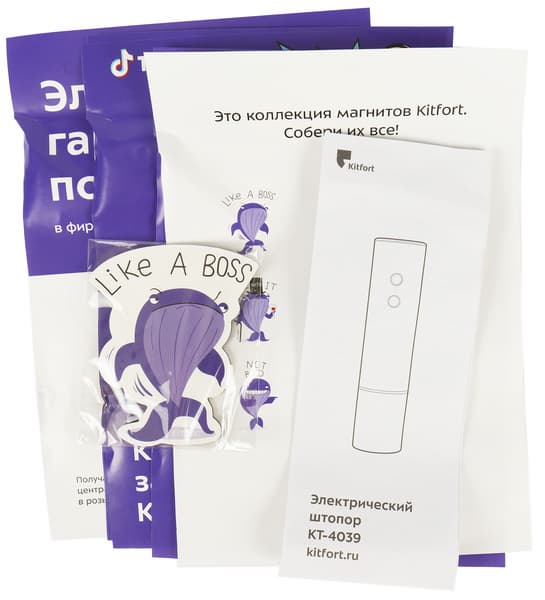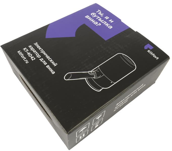 Штопор Kitfort KT-4039 мы получили в черно-фиолетовой картонной коробке, оформленной в фирменном стиле компании: на лицевой стороне схематическое изображение устройства, индекс модели и непременный слоган, придумываемый маркетологами Kitfort для каждой новой модели. На этот раз рифма им удалась.