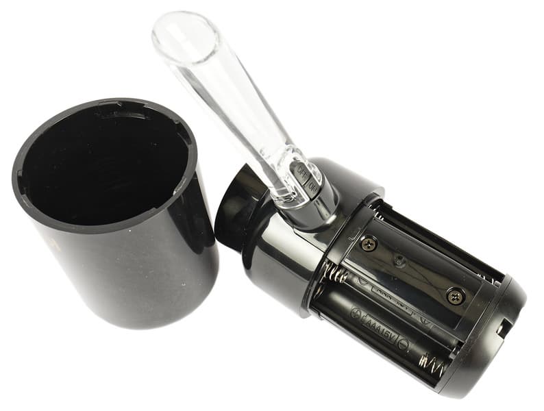 Чтобы приблизительно определить срок автономной работы устройства на одном комплекте элементов, мы воспользовались четырьмя солевыми батарейками одной из самых распространенных марок среднего ценового сегмента. На комплекте «средних» элементов аэратор позволил разлить вино из одиннадцати бутылок подряд.