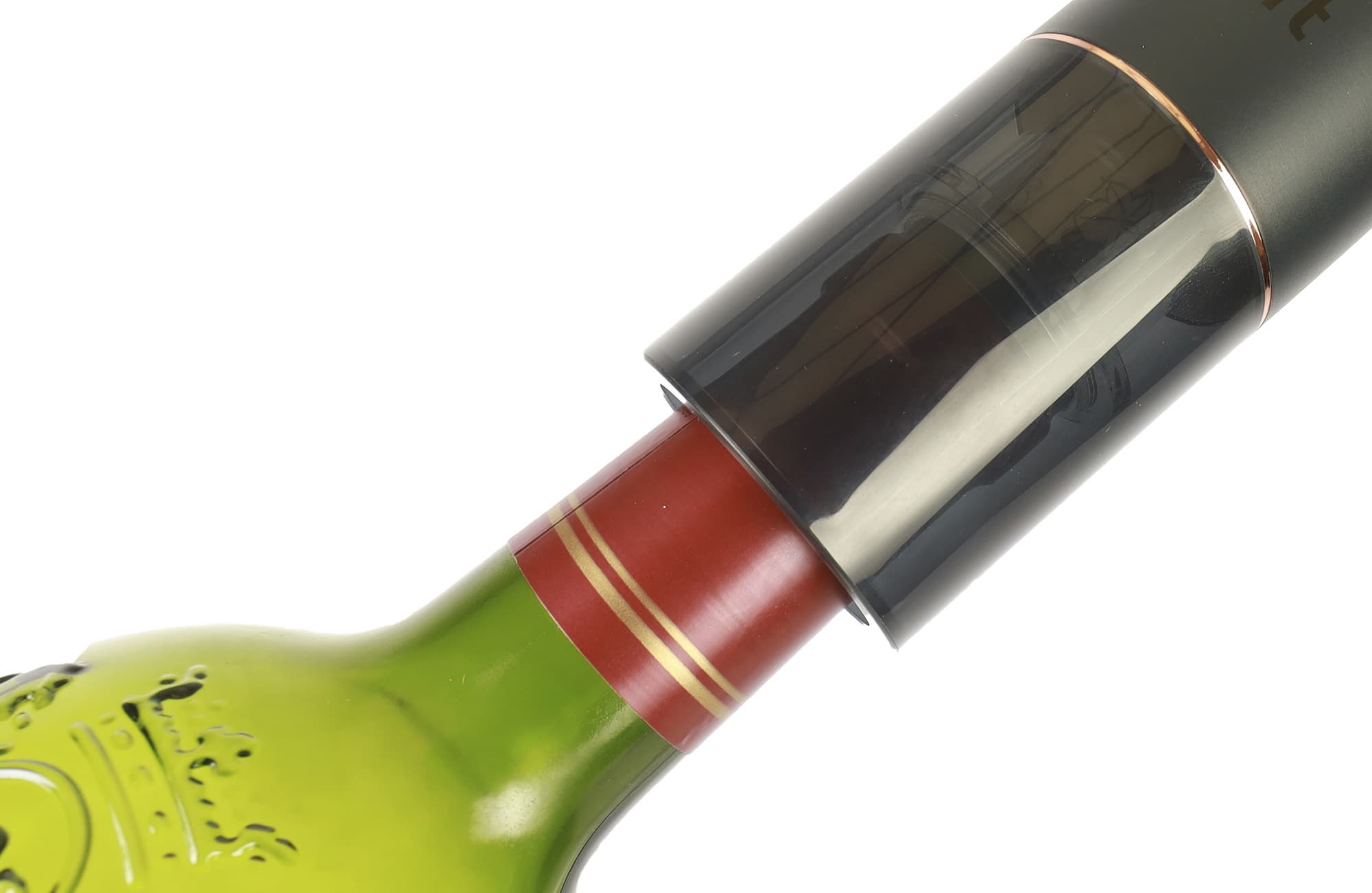 После того, как бутылка будет открыта, силиконовый шланг необходимо присоединить к разъему на корпусе аэратора, опустить внутрь емкости, а корпус плотно установить на горлышко.