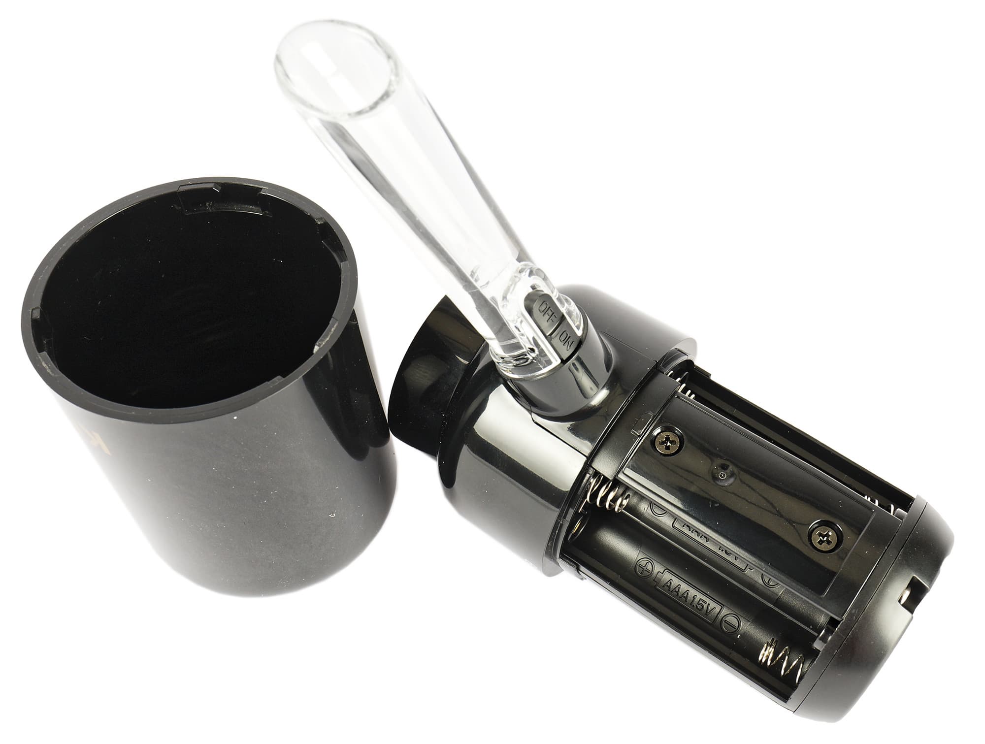 Питание аэратора обеспечивают четыре батарейки ААА, устанавливаемые попарно в гнезда внутри корпуса.