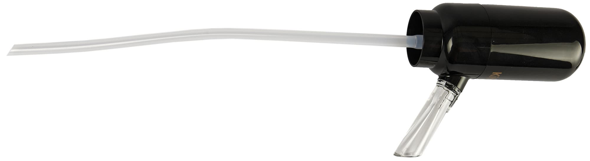 Для подачи жидкости служит прозрачная силиконовая трубка, надевающаяся на шток в нижней части корпуса. Ее длины достаточно для большинства стандартных (0,75 л) винных бутылок.