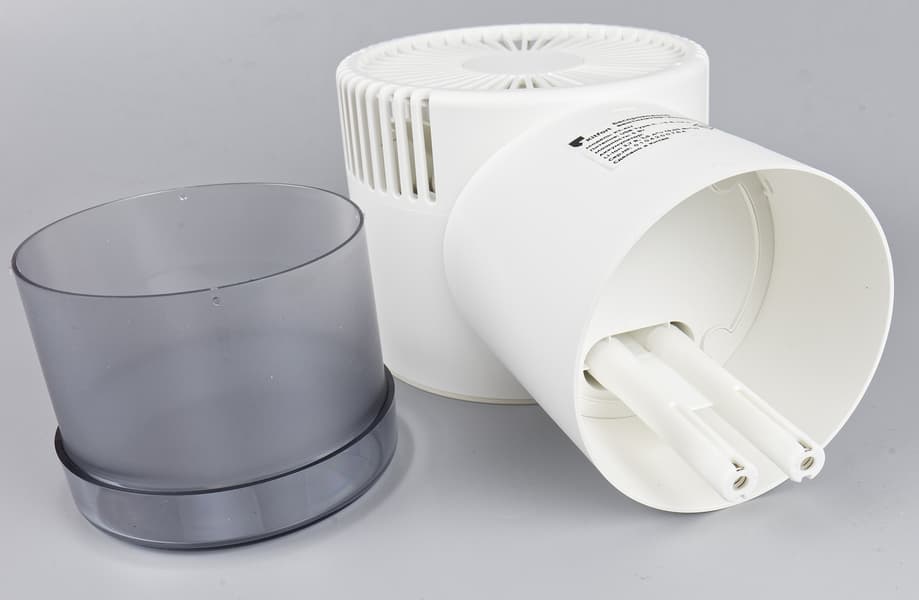 Белый пластиковый корпус состоит из двух цилиндров. В нижнем (вертикальном) размещаются резервуар для воды, аккумулятор и управляющая электроника, в верхнем (горизонтальном) смонтирован небольшой четырехлопастный вентилятор.