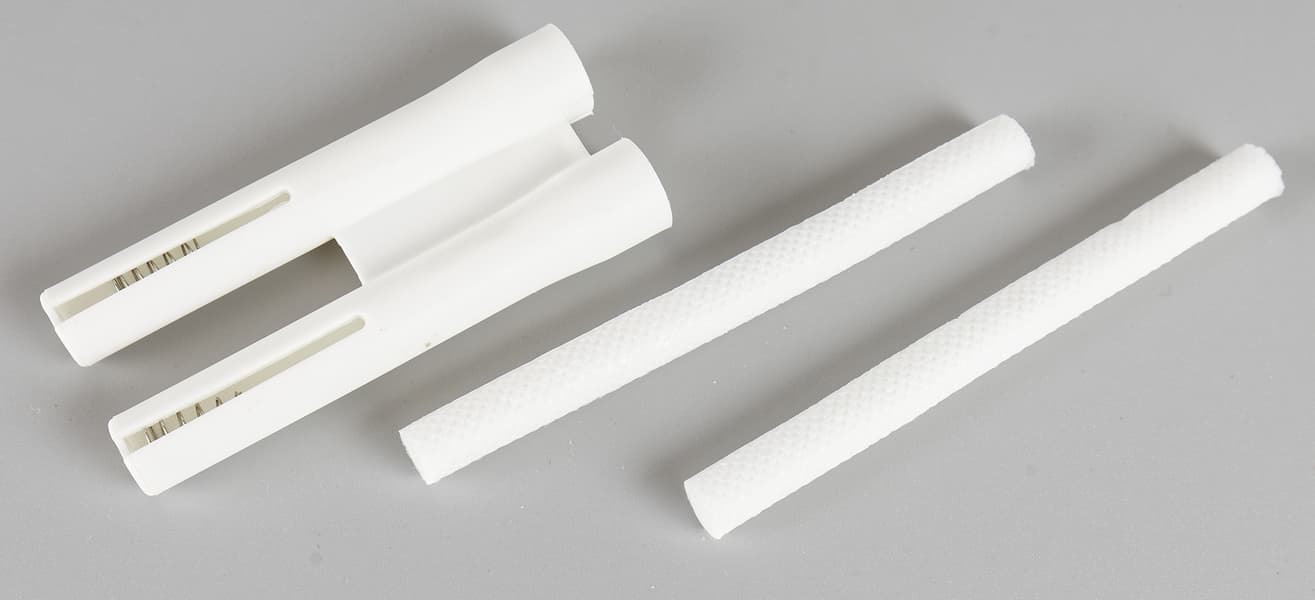 Оригинально решена система подачи жидкости из резервуара на ультразвуковые излучатели: внутри пластиковой вилки находятся два пористых элемента, играющие роль капилляров и поджатые снизу пружинками. По ним вода и поднимается наверх.