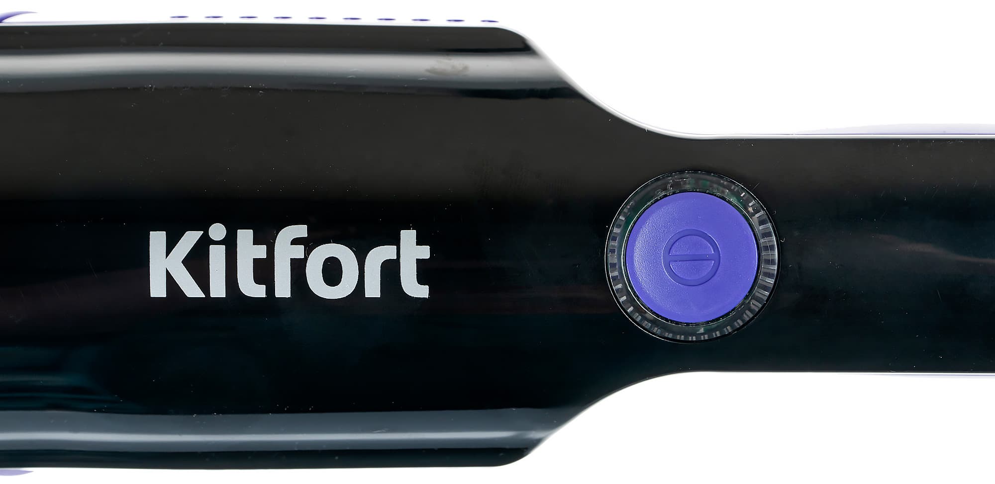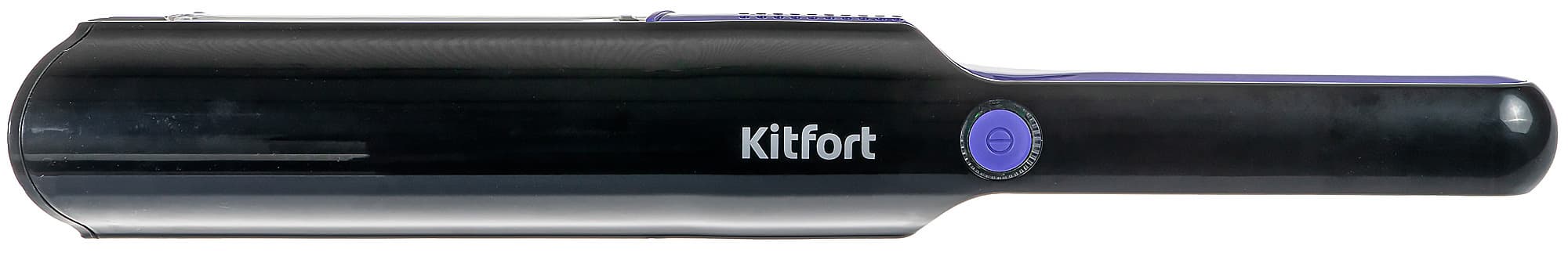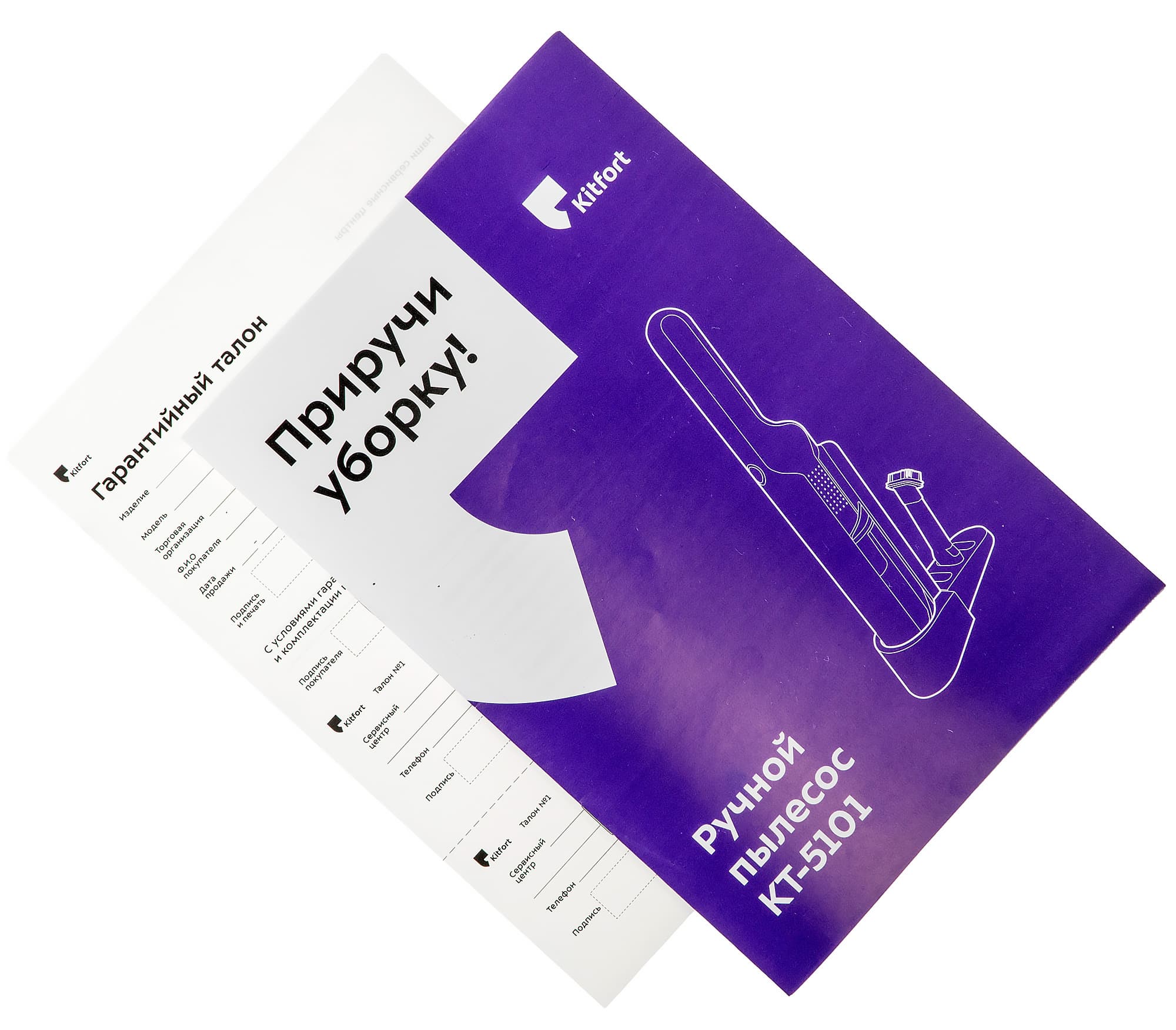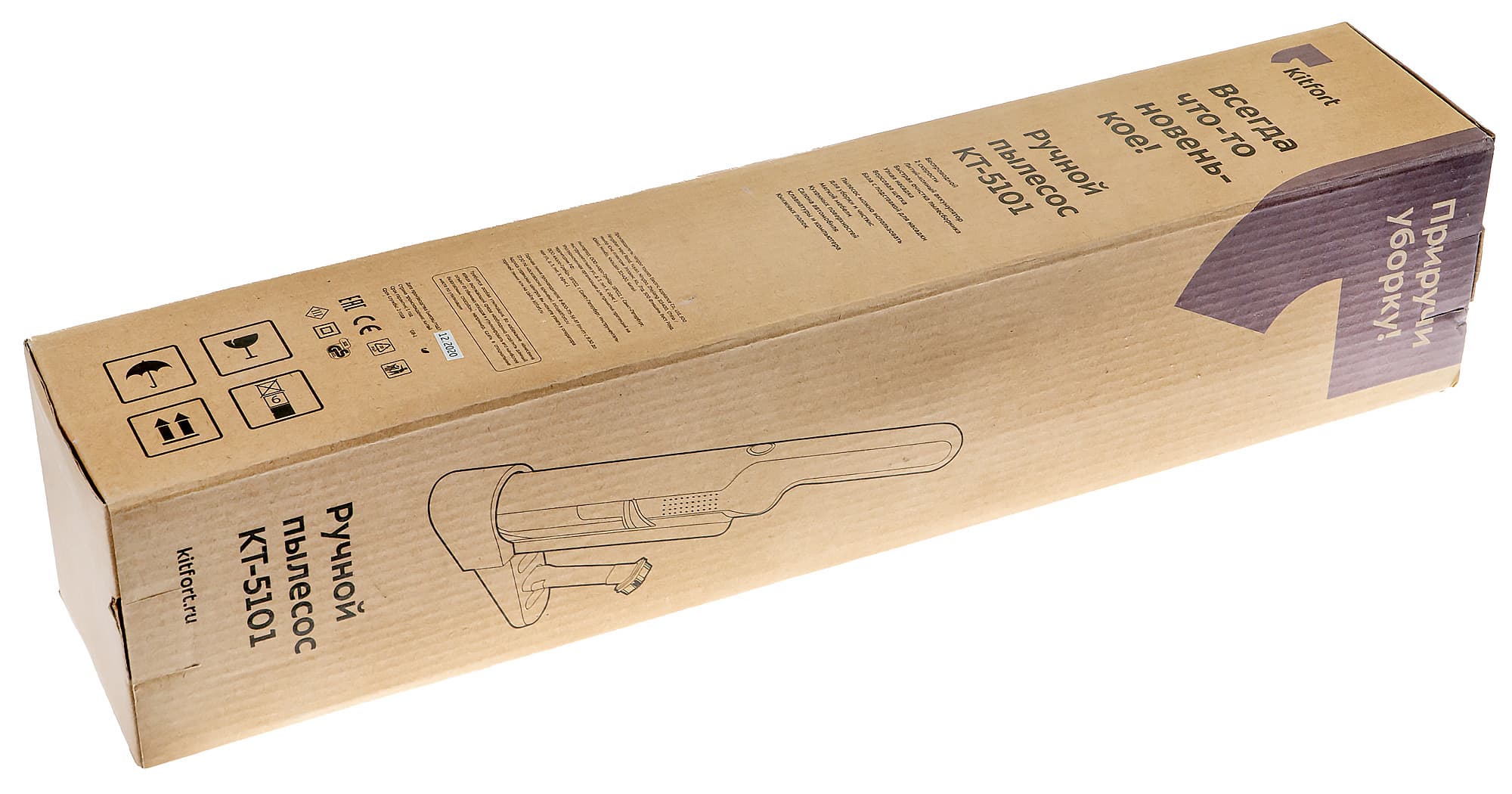 Упакован пылесос в небольшую продолговатую картонную коробку. Ее оформление традиционно для компании Kitfort: коричнево-фиолетовая гамма, схематическое изображение устройства на лицевой стороне, технические характеристики — на боковых. Как принято у производителя, у каждого класса бытовой техники есть собственный девиз. Для ручных пылесосов маркетологи компании выбрали слова «Приручи уборку!».