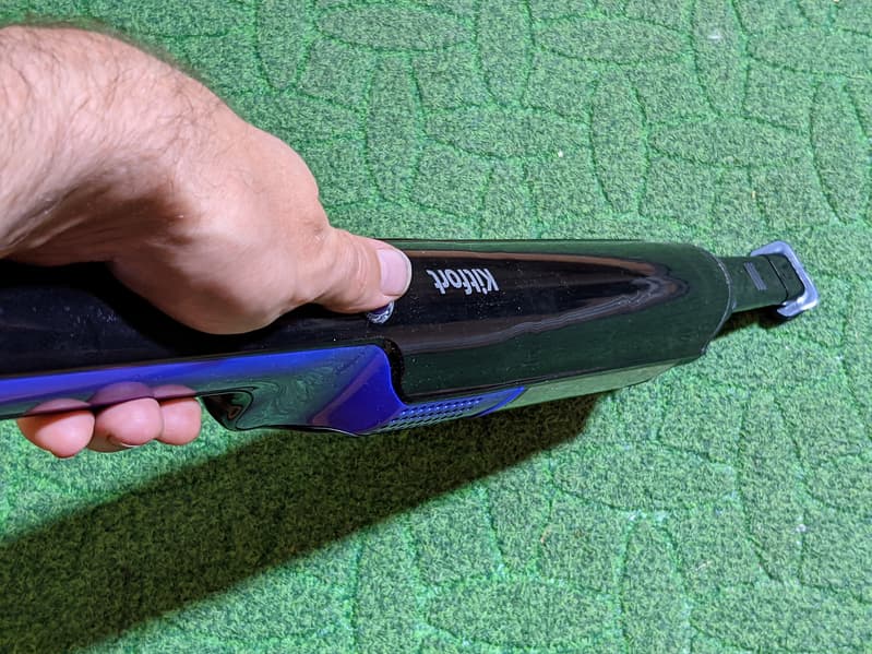 Как и предыдущая модель, Kitfort KT-5101 имеет удлиненную форму и больше напоминает жезл или большой фонарик, а не ручной пылесос традиционной конструкции. Черный пластиковый корпус украшен синими декоративными элементами. Овальная в сечении ручка сконструирована как продолжение цилиндрического моторного блока с аккумулятором, который расположен между ней и мусоросборником.