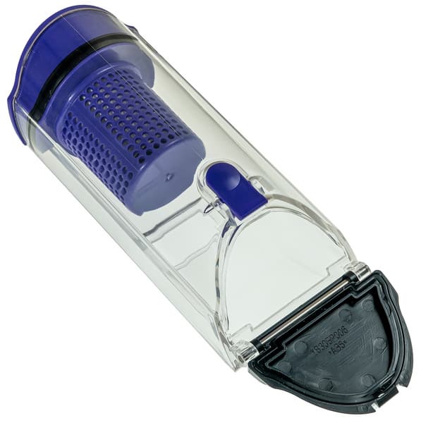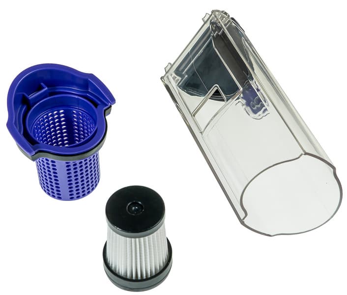 Фильтр грубой очистки представляет собой синий пластиковый цилиндр с сетчатыми стенками. Он вставляется в корпус контейнера для мусора и удерживается в нем силой трения. Последняя ступень фильтрации — HEPA-элемент в форме усеченного конуса, находящийся внутри предварительного фильтра.