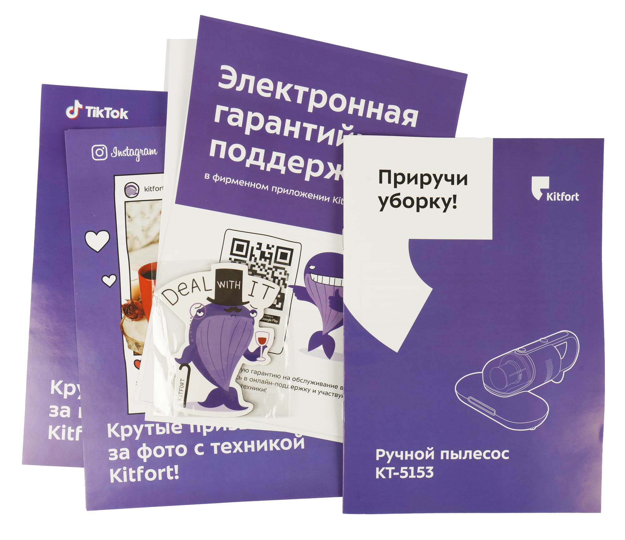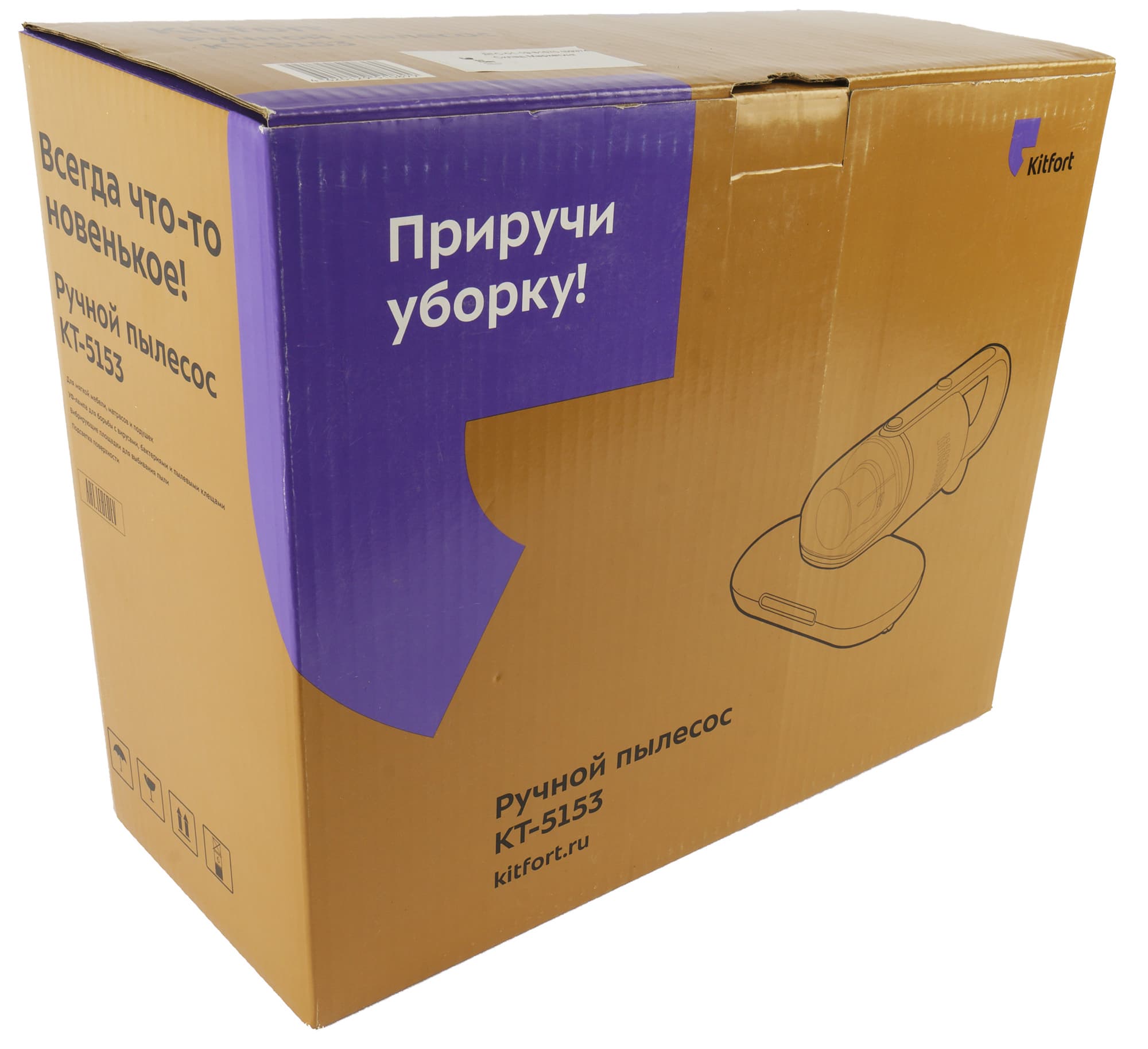 Пылесос KT-5153 упакован в коричнево-фиолетовую упаковку в фирменном дизайне Kitfort. Спереди на ней напечатаны логотип производителя, индекс модели, схематическое изображение устройства и непременный девиз, который маркетологи компании придумывают для каждой модели бытовой техники. Для ручного прибора они сочли забавным лозунг «Приручи уборку!».