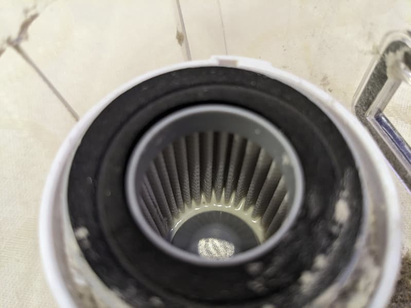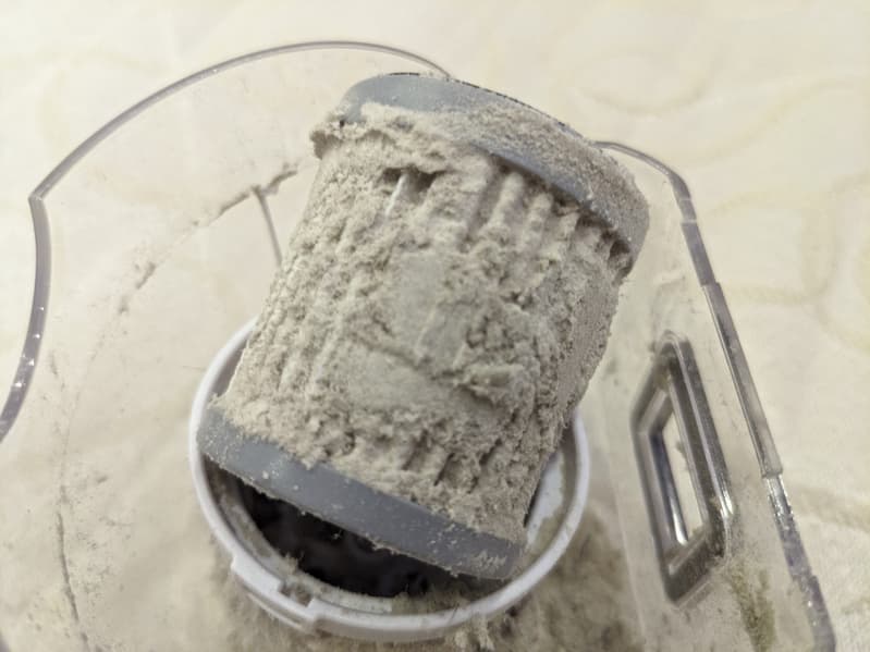 Микроскопическая перфорация на решетке задерживает заметное количество крупного мусора, ворсинок и пыли, но еще больше загрязнений проходят через предварительный фильтр и попадают на цилиндрический HEPA-элемент.
