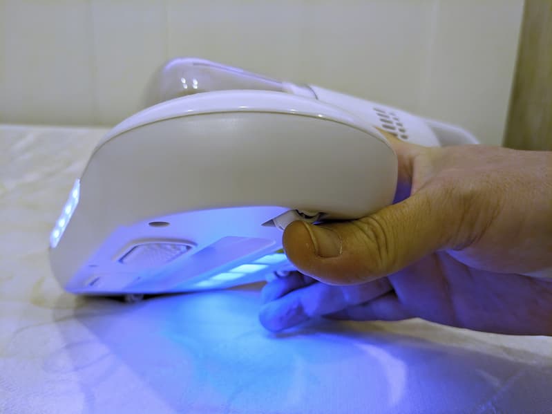 Мотор включается нажатием кнопки, а вот УФ-лампа и передняя светодиодная подсветка загораются только тогда, когда рабочая поверхность плотно прижата к обрабатываемой.