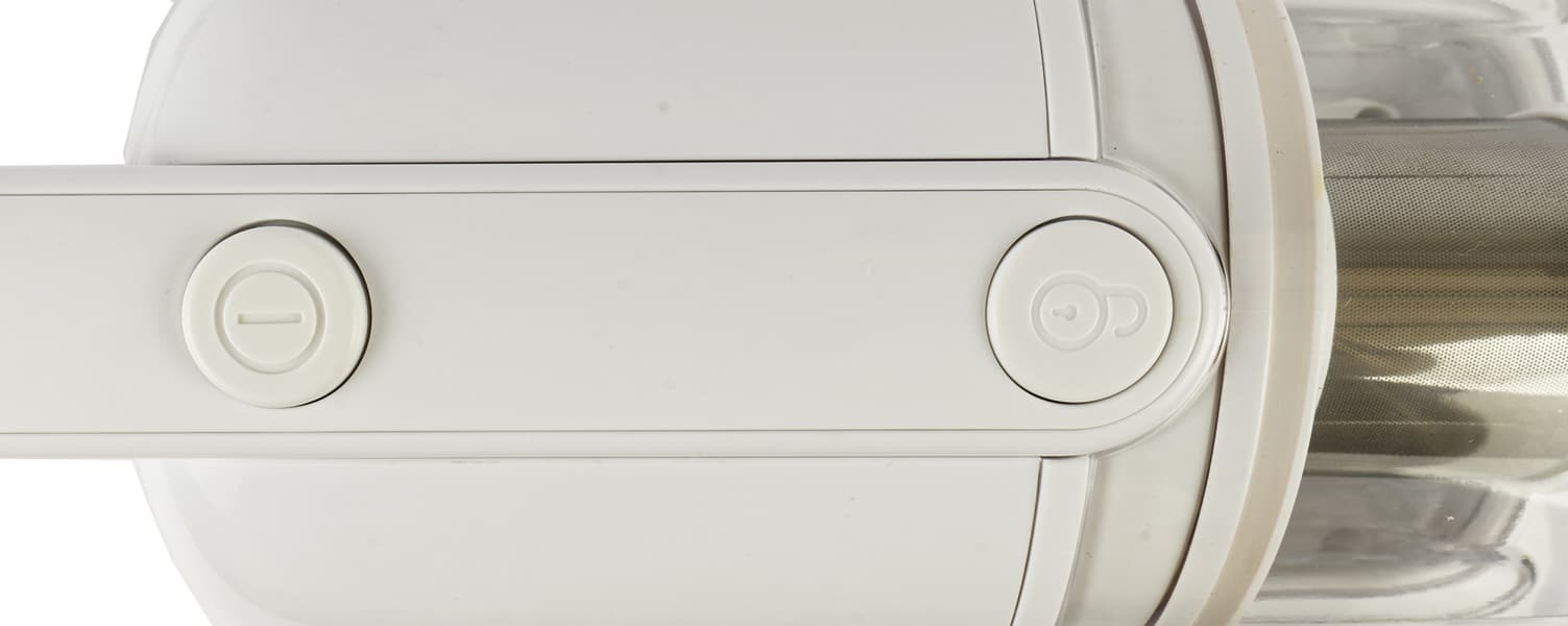 Прозрачный корпус мусоросборника с системой фильтрации расположен в передней части моторного блока и удерживается круглой кнопкой-защелкой.
