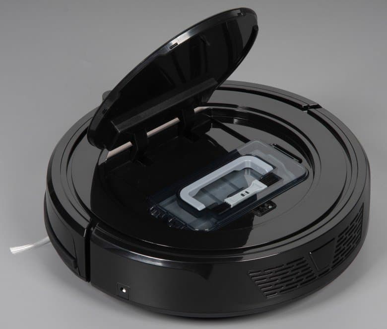 Корпус робота изготовлен из пластика. Бампер и верхняя часть корпуса черная с зеркально-гладкой поверхностью и без покрытия, царапается она легко и следы от пальцев на ней хорошо заметны. Лучше, если бы робот был сверху светлым и не таким марким. Днище — черное матовое без покрытия. Верхняя часть крышки отсека пылесборника — из прозрачного, но плотно тонированного пластика. Сверху спереди есть вставка из тонкого алюминия с неполированной поверхностью.