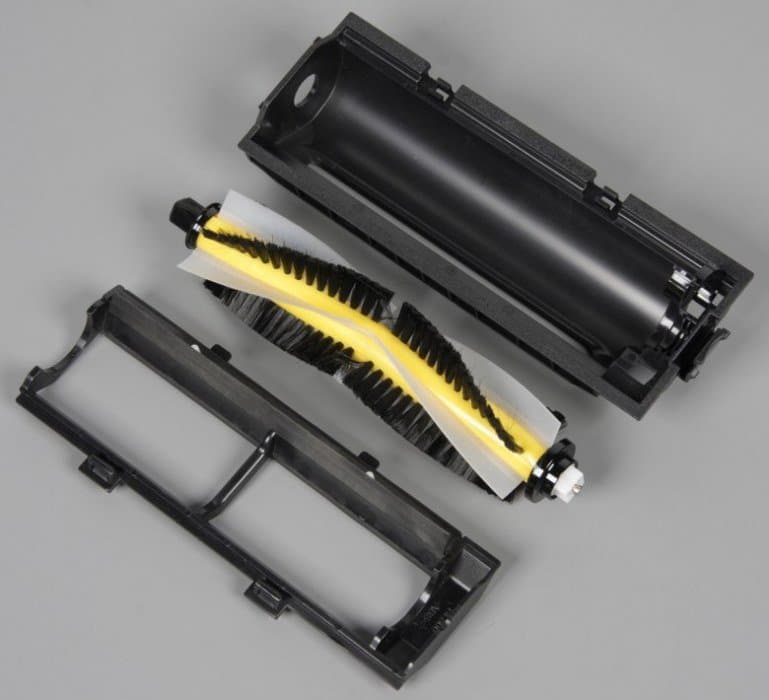 Блок без щетки имеет резиновую юбку-скребок и оптический датчик засора воздуховода. Этот блок лучше использовать для уборки легкого мусора с гладких полов, например, шерсти и пыли с ламината. Блок со щеткой активнее воздействует на убираемую поверхность, он лучше справится с уборкой ковровых покрытий и крупного тяжелого мусора, который щетка может закинуть в пылесборник по инерции. Правда, на вращающуюся щетку будут наматываться волосы, нитки, волокна и т. д. Вал щетки гладкий и относительно большого диаметра — это облегчает освобождение вала просто пальцами без помощи инструментов от всего намотавшегося. Щетина на этой щетке относительно мягкая, а лопасти-скребки из полупрозрачного пластика тонкие, нежесткие, но упругие. Рабочая ширина щетки 150 мм. Стальная ось в торце щетки вращается в подшипнике скольжения в виде бронзовой втулки. Это правильное конструктивное решение, так как подшипники качения в этом узле рано или поздно заклинивает, из-за намотавшихся на сепаратор волос, шерсти и прочего. Щетка в блоке фиксируется рамкой из черного пластика. На этой рамке есть резиновый скребок, который помогает щетке подхватывать мусор с пола и забрасывать его в пылесборник. Край рамки со скребком ходит вверх-вниз на 4 мм, что позволят скребку следовать рельефу пола. Часть скребка, выступающая внутрь, помогает снимать мусор со щетины и лопастей щетки. На рамке есть перемычка, которая уменьшает вероятность наматывания на щетку краев ковриков и т. д. Блок со щеткой легко разбирается для инспекции и очистки — снимается рамка, вставка с подшипником, защитный чехол подшипника, а скребки вытягиваются из направляющих.