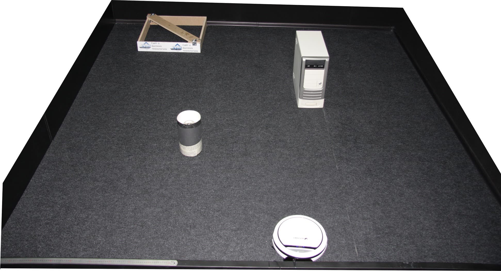 Уборка в тестовом помещении до разряда аккумулятора показала, что робот способен убрать почти весь мусор на доступной ему территории, совсем немного риса осталось в углах и у дальней стенки узкого загона: