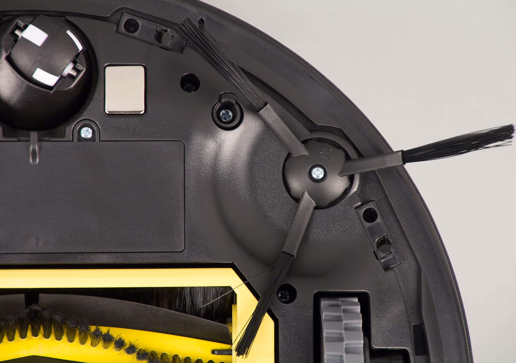 Отметим, что этот робот без проблем работал на черном ковролине, тогда как у большинства других роботов датчики перепада высоты приходилось деактивировать, чтобы роботы не считали черный пол провалом в никуда. Передний ролик изготовлен из черного упругого пластика чередующегося с белым и жестким. Сделано это не просто так, а для того, чтобы робот с помощью оптического датчика, расположенного под роликом, мог определять, перемещается ли он во время уборки, и если нет, то предпринимать попытки высвободиться или подать сигнал пользователю об ошибке. Боковая щеточка имеет длинную и жесткую щетину, пучки которой выходят из упругих поводков.