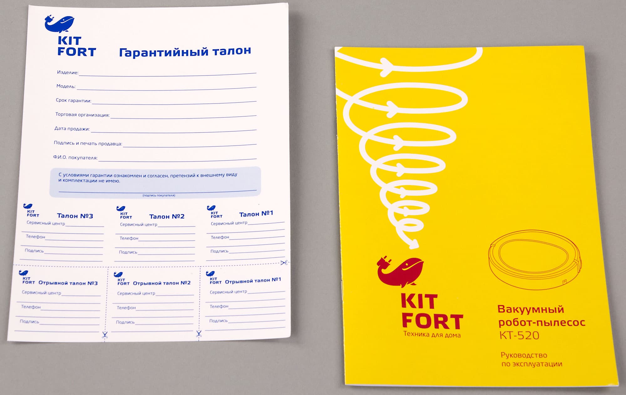 Робот-пылесос Kitfort KT-520 имеет круглый корпус, передний механический бампер, два ведущих колеса, широкую основную щетку и одну боковую щеточку. Такую конструкцию можно считать классической. Проворачиваемые рукой редукторы, передний ролик с датчиком вращения, подшипники скольжения основной щетки, подвешенный, а не закрепленный жестко блок основной щетки, относительно низкий корпус без выступающих вверх частей и ряд других особенностей улучшают эксплуатационные свойства робота, способствуют росту качества уборки, в том числе на коврах, и повышают срок службы устройства.