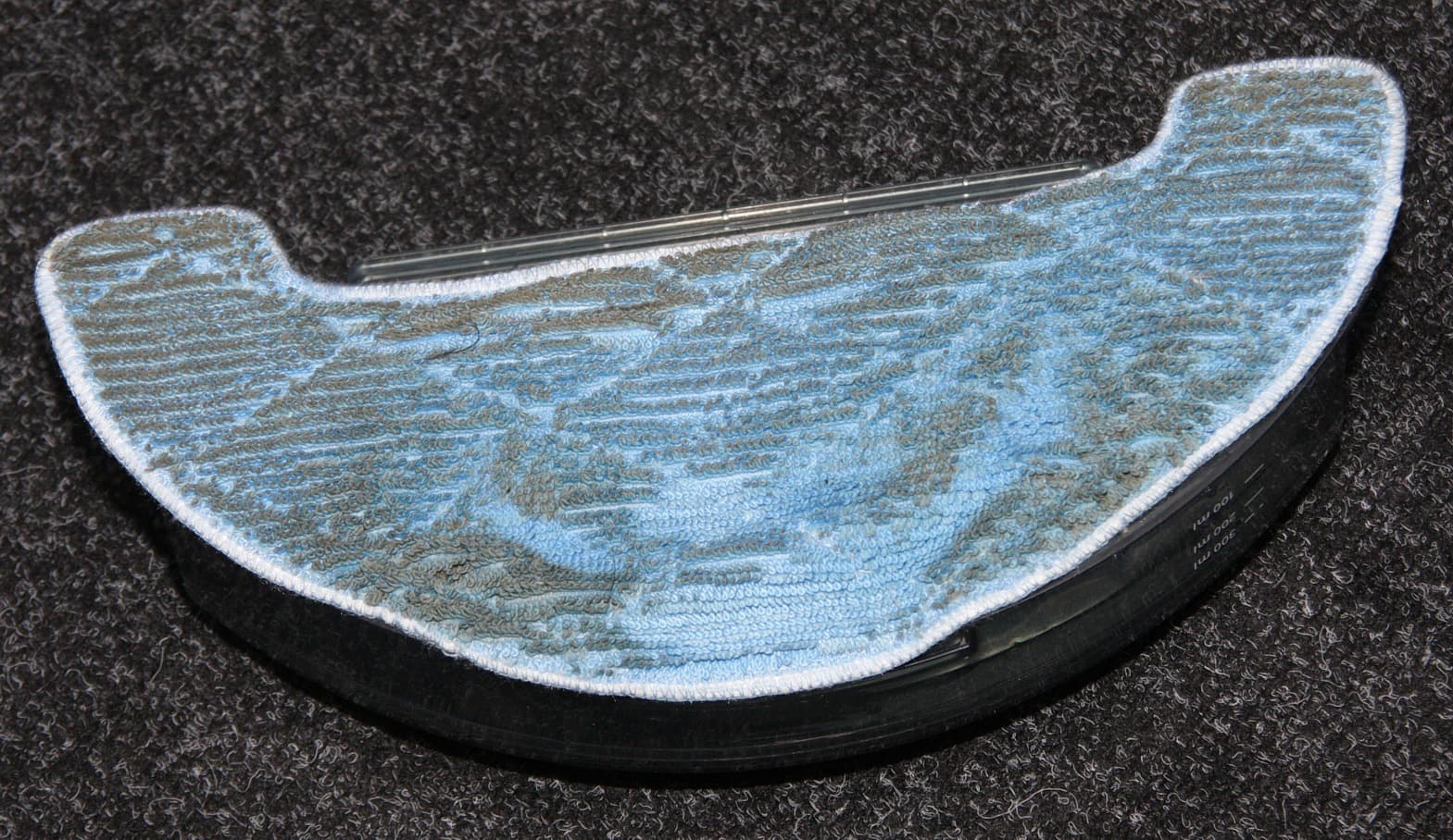 В режиме влажной уборки робот убирал помещение площадью 30 м² (мебели относительно много) в течение 16 минут, после чего мы его остановили. След был умеренно влажным общей шириной примерно со всю салфетку, но с нешироким пропуском посередине. Израсходовано было 80 мл воды. Так выглядит салфетка после уборки: