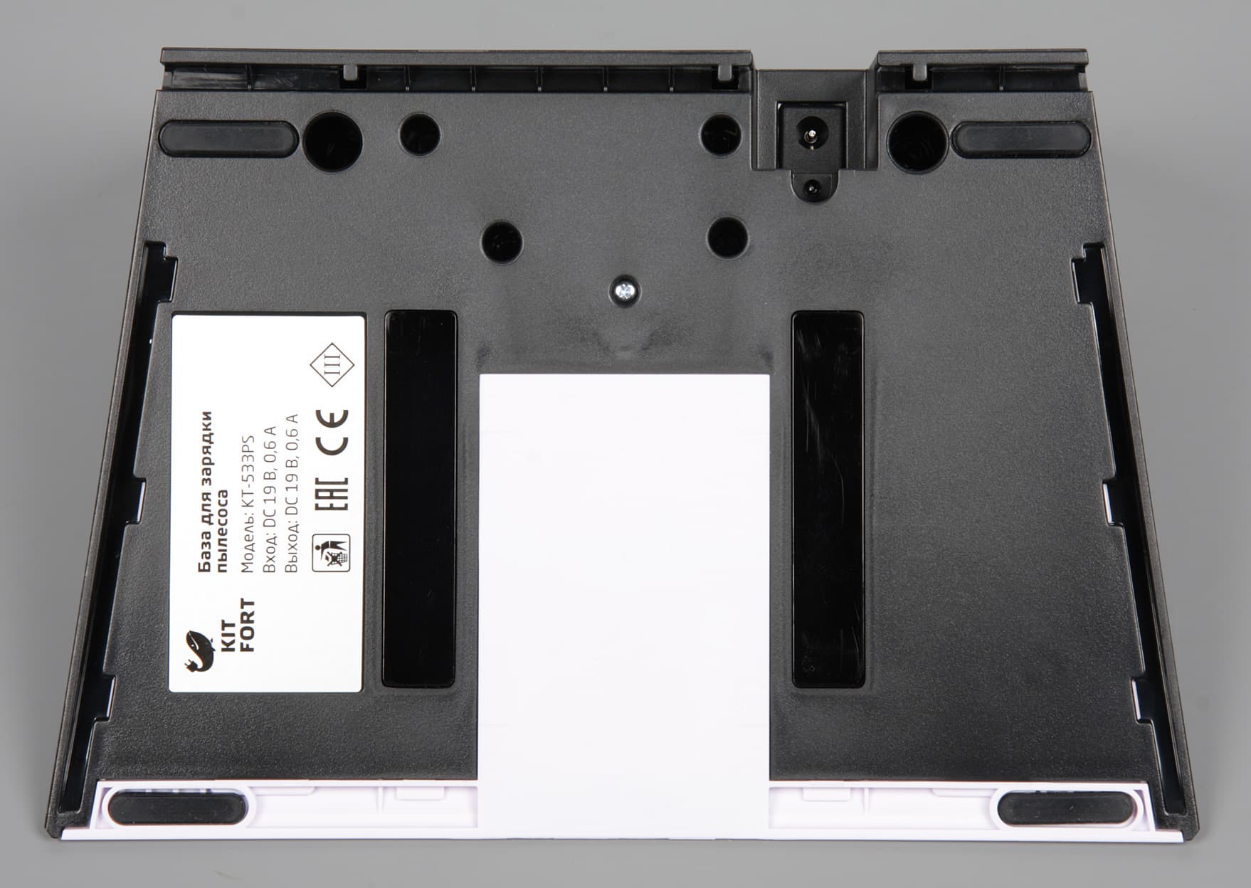 База, на которой пылесос заряжается, имеет большое основание, на которое снизу наклеены четыре противоскользящие резиновые ножки-накладки.