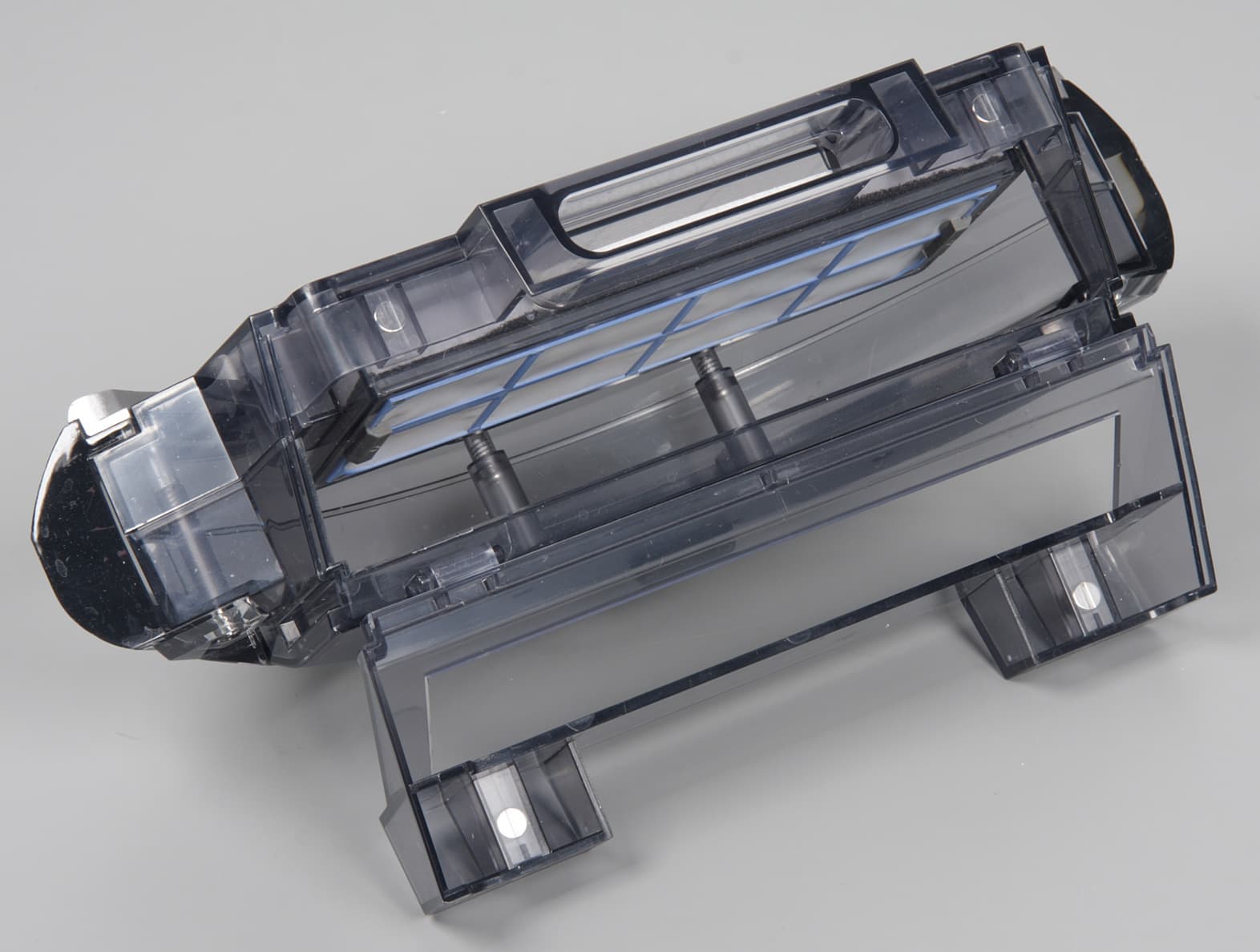 Корпус пылесборника выполнен из слегка тонированного прозрачного пластика, но особой пользы это не приносит, так как взглянуть на него можно только или перевернув пылесос днищем вверх или вынув пылесборник. Передняя часть пылесборника откидывается на большой угол, что позволяет без труда вытряхнуть скопившийся мусор. Однако отсек для мусора относительно узкий и его будет неудобно чистить с помощью обычного пылесоса с щелевой насадкой, также передняя перегородка на откидывающейся части невысокая, поэтому мусор легко просыпается из закрытого пылесборника. Именно высота этой перегородки ограничивает полезную емкость пылесборника по отношению к тяжелому мусору.