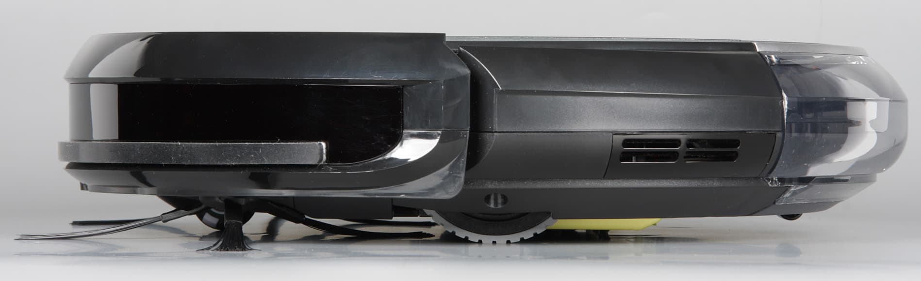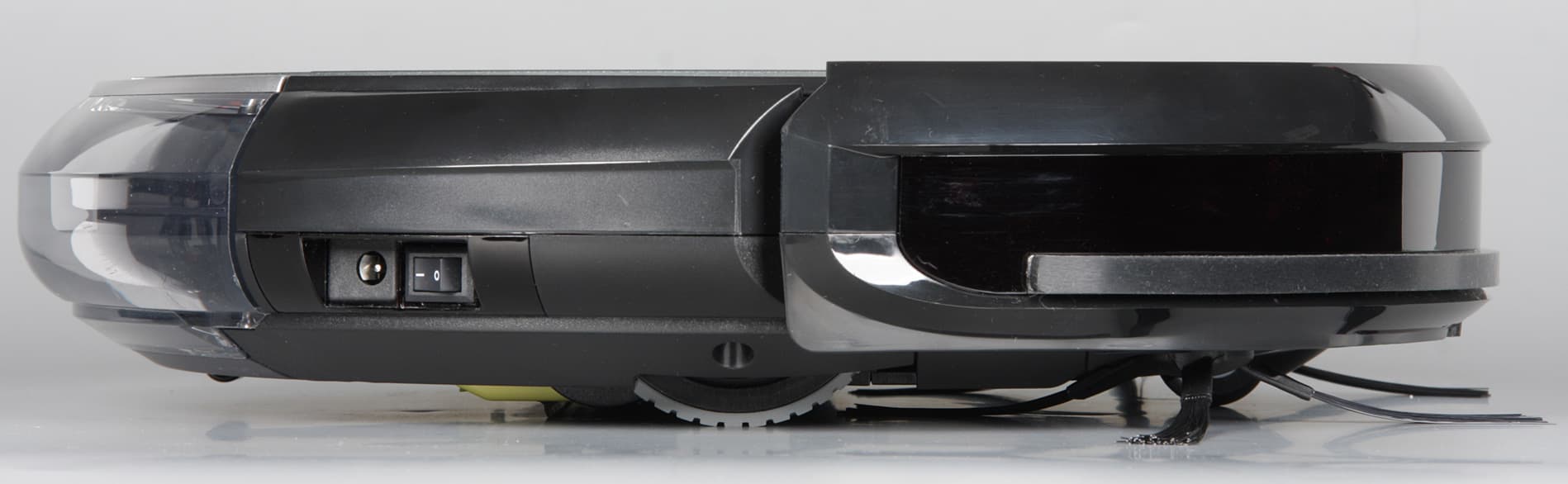 Корпус робота изготовлен в основном из черного пластика без покрытия и с матовой поверхностью. Преимущественно темный цвет корпуса осложняет поиск робота в темных закоулках квартиры, когда он по какой-то причине не вернется на базу, также робота сложнее заметить боковым зрением, когда он путается под ногами, а значит, с большей вероятностью на него можно наступить. Верхняя панель прикрыта пластиной из минерального закаленного стекла, поэтому она не царапается и легко очищается, однако из-за темной подложки панель очень маркая, она моментально покрывается следами от пальцев. На верхней панели ближе к передней части есть две механические кнопки: одна с подсвечивающимися словом Auto и значком питания, вторая — с подсвечивающимися значком спирали.