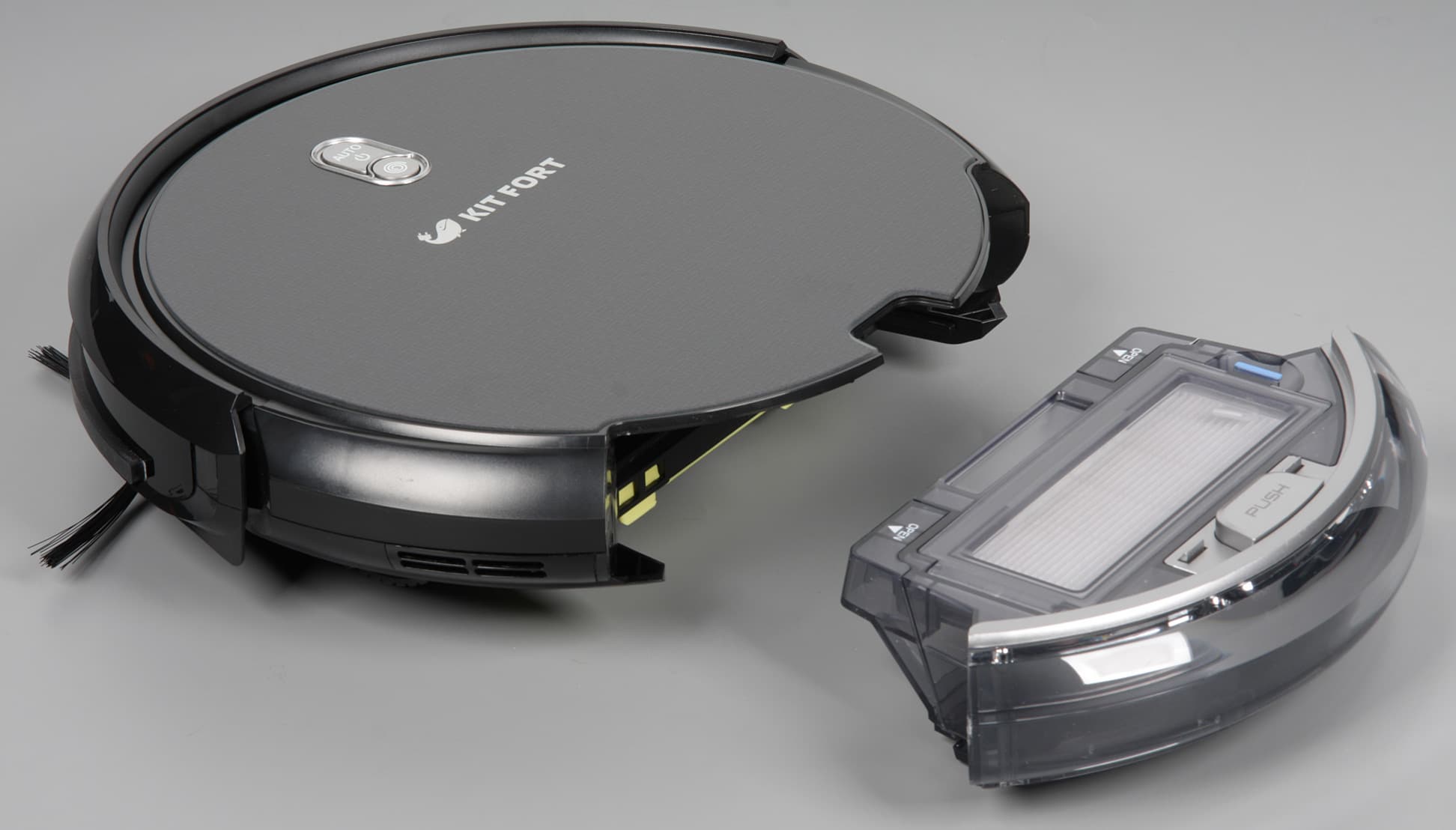 Нажав на фиксатор сзади, можно отсоединить пылесборник от корпуса робота.