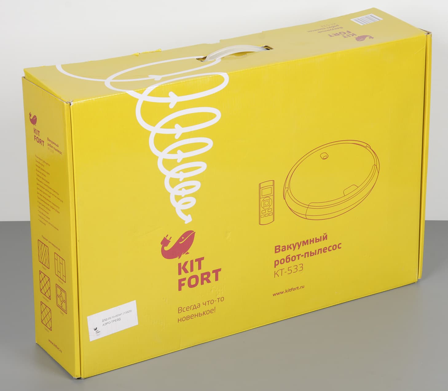 Робот-пылесос Kitfort KT-533 упакован в коробку яркого лимонного цвета, что снова подтверждает эмпирическое правило: использование одного яркого цвета для фона упаковки и обложки руководства является элементом фирменного стиля компании Kitfort. Коробка оснащена пластиковой ручкой, поэтому донести покупку до дома будет нетрудно.