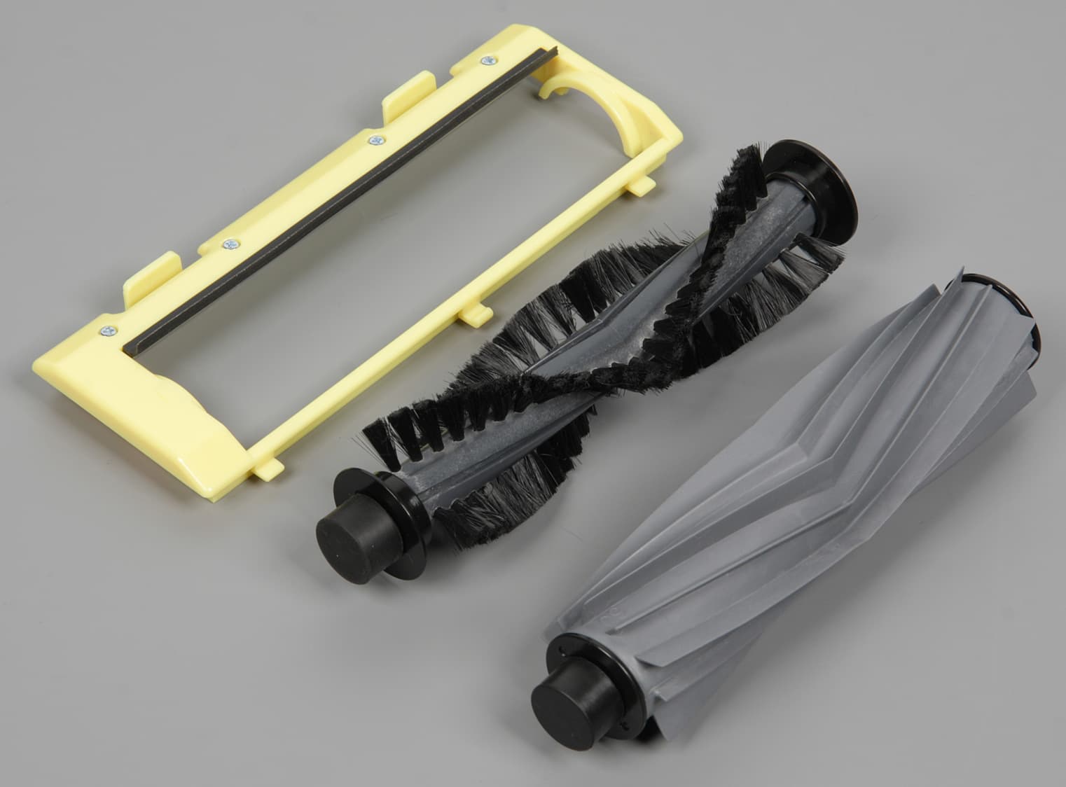 Запасные части и расходные материалы в комплекте поставки представлены сменным складчатым фильтром последней ступени, валиком-скребком, парой салфеток из микроволокна и набором (правая и левая) боковых щеток. Есть и комбинированная щетка-гребенка, которую можно использовать для чистки пылесборника, самого робота и основной щетки в частности.