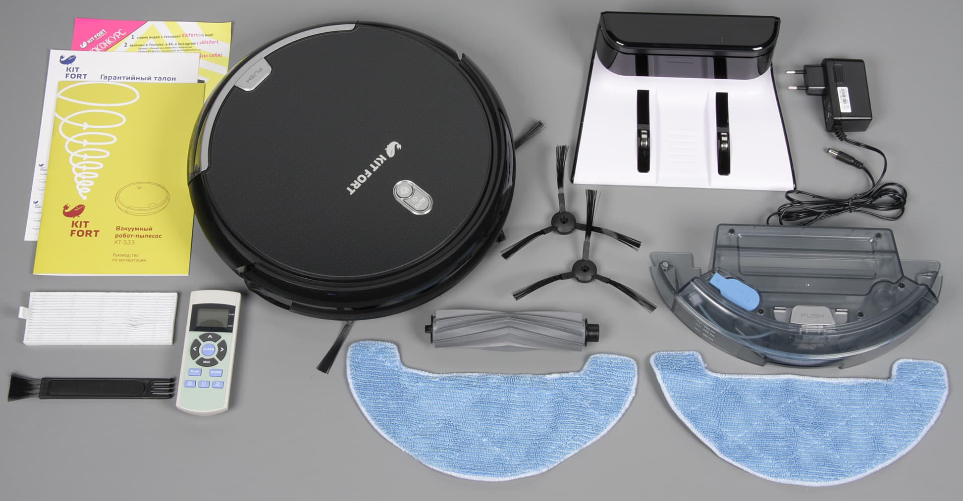 В автоматическом режиме Kitfort KT-533 убирает, меняя алгоритм движения, и сам возвращается на базу для зарядки аккумулятора. При необходимости пользователь может вручную управлять движением робота, включать режимы интенсивной очистки локального участка или следования вдоль стен, также робота можно запрограммировать на ежедневную уборку в заданное время. Функциональность робота дополнена способностью выполнять влажную уборку гладких полов. Для этого взамен обычного пылесборника нужно установить специальный контейнер с резервуаром, предварительно заполненным водой, а на днище этого контейнера следует закрепить чистящую салфетку, которая во время движения робота увлажняется жидкостью из резервуара и протирает пол. К особенностям робота относятся возможность установки альтернативной безворсовой резиновой щетки, на которую в меньшей степени наматываются волосы, шерсть, нитки и пр., поэтому данного уборщика можно рекомендовать при наличии шерстистых домашних животных.